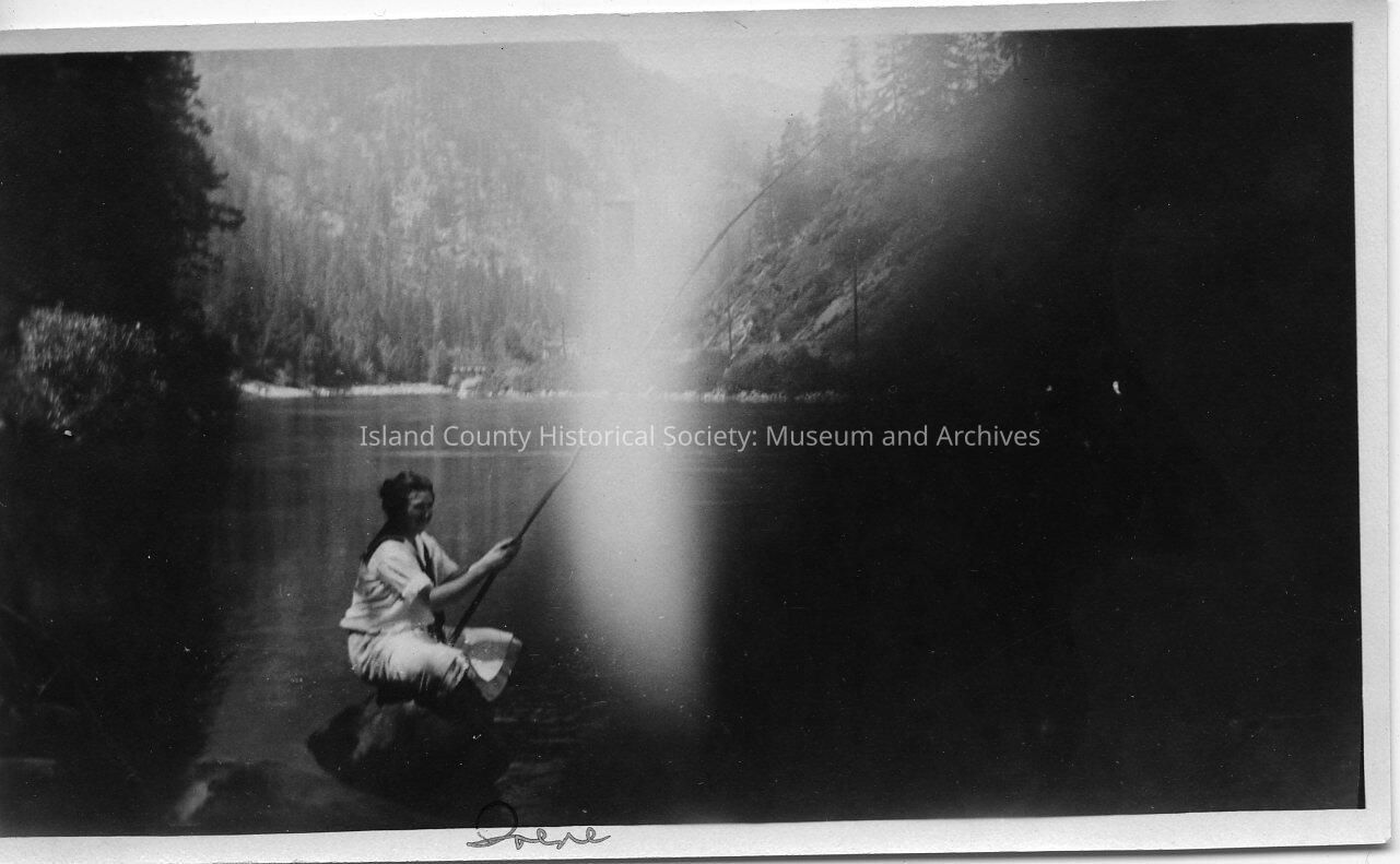 Black & white photo of girl with a fishing pole by a lake. "Irene" written on photo. No date on the photo.