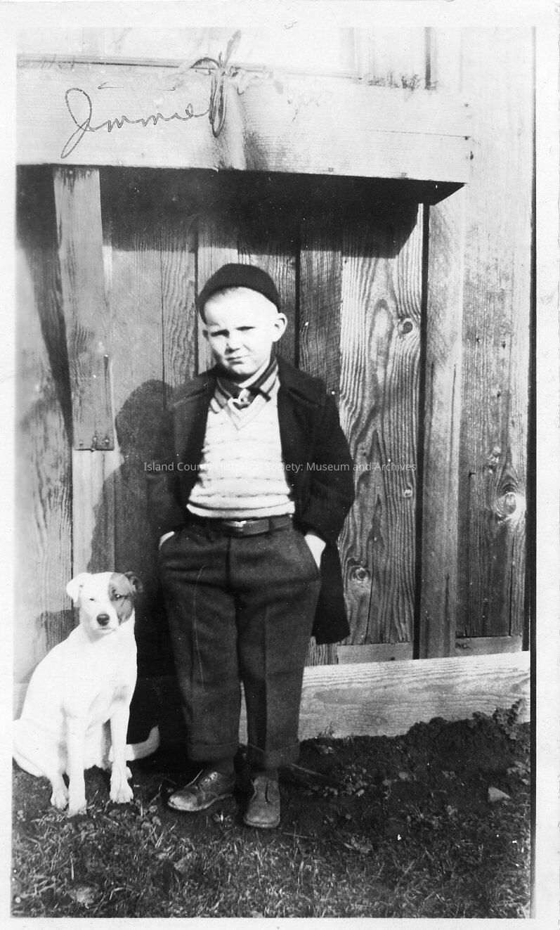 Black & white photo of young boy with dog taken in front of a fence. No date on the photo. Name written on photo, "Jimmie".