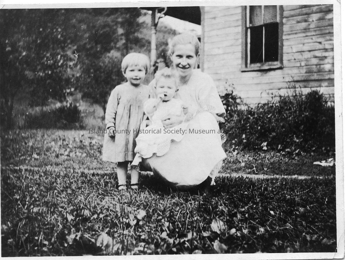 Black & white photo of women with two small children taken with a house in background. No names or date on the photo.