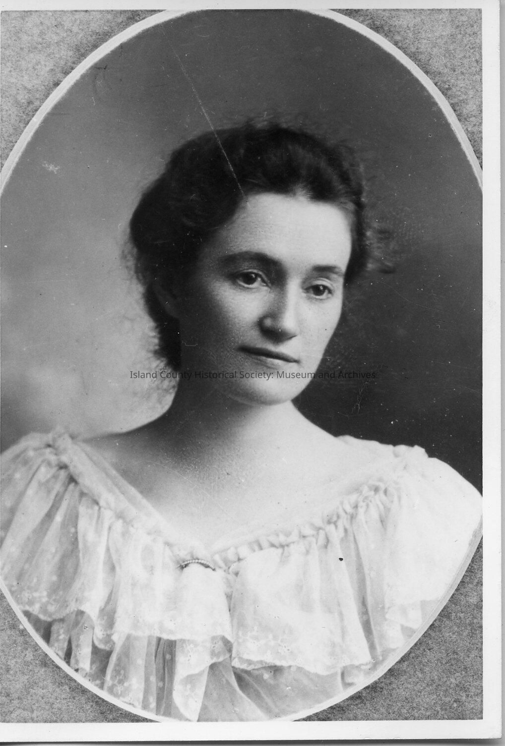 Black and white photo of Elizabeth Sargent. The photo is framed in a oval and the lady has her hair up and is wearing a lace shirt with a clasp at the neckline. On the back of the picture is: Elizabeth Sargent