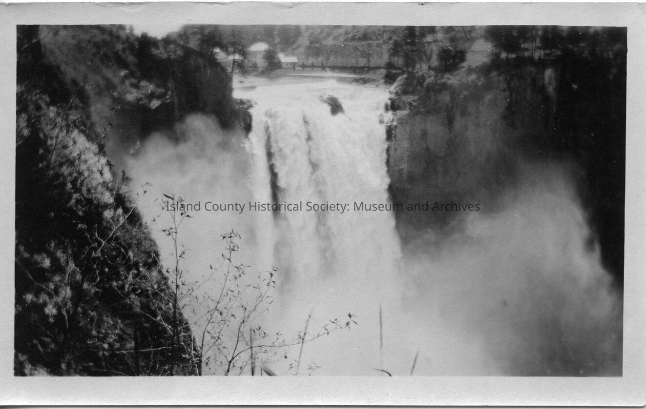 Black & white photo (landscape) of waterfall. Appears to be Snoqualmie Falls. No names or date on the photo.