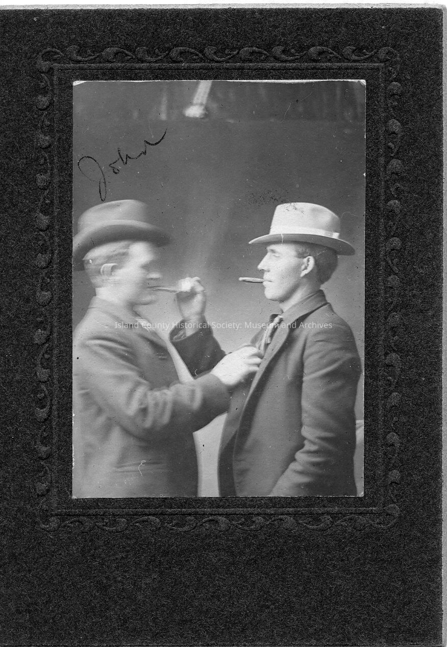 Black & white portrait photo of two men facing each other smoking cigars. Name written over the left man, "John". No names or date on the photo. Photo is on card stock.