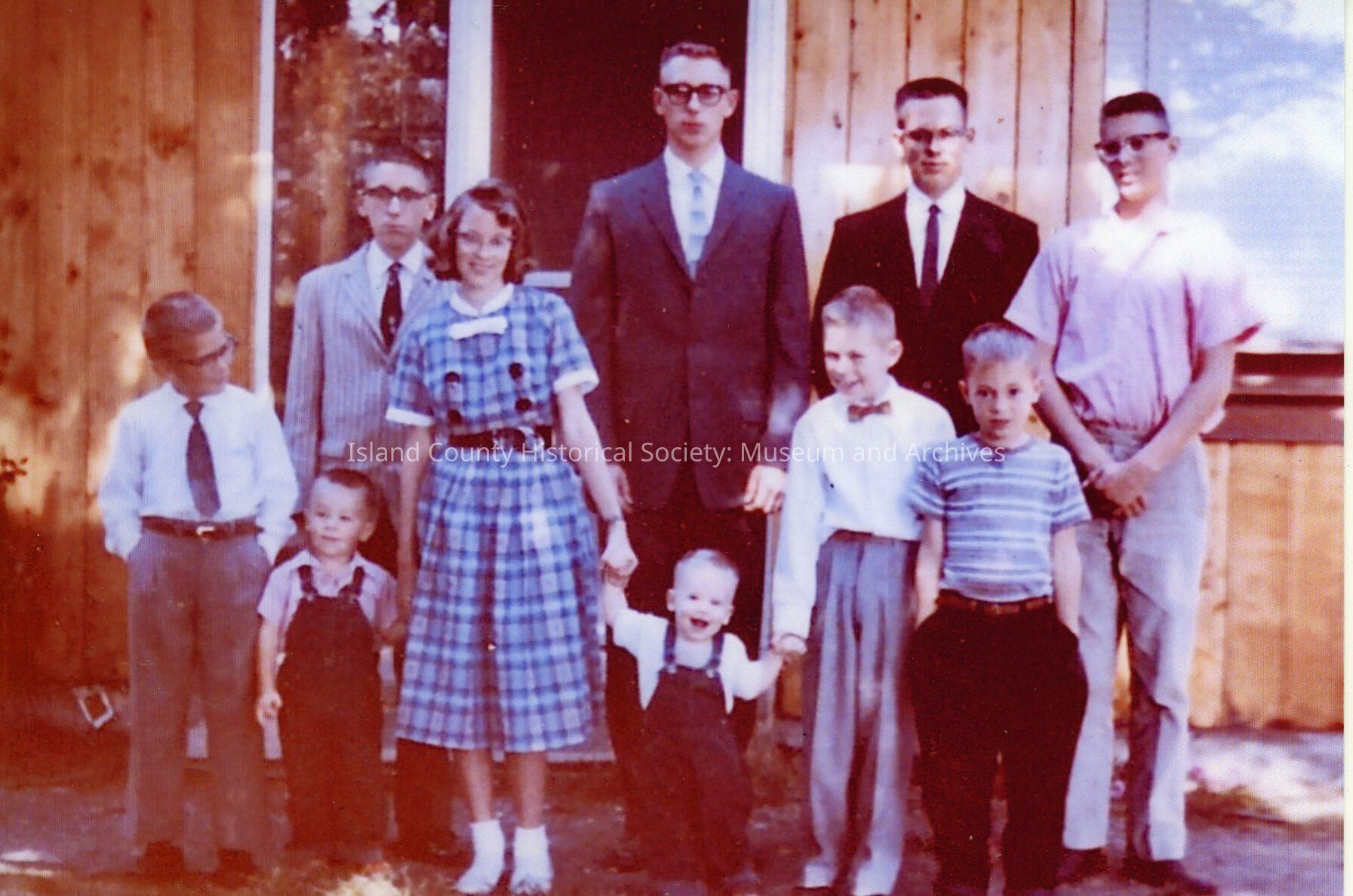 Color photo of Dr. Paul Bishop's children - 10 Circa 1960. Listed on the back of the photo is each childs name by row.
