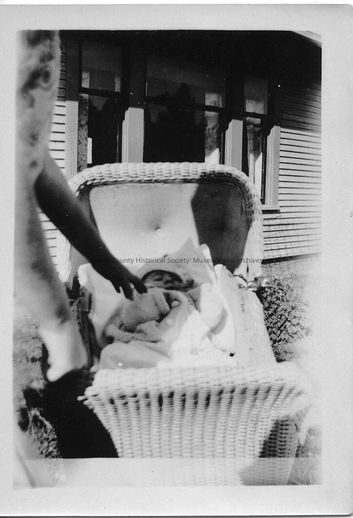 Black & white photo of a baby in a carriage. Name written on back of photo, "Jack Howell". No date on the photo.