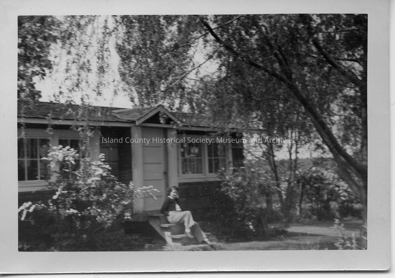 A photo of a building with a woman sitting on the steps. Handwritten on the back is "The Cabin."