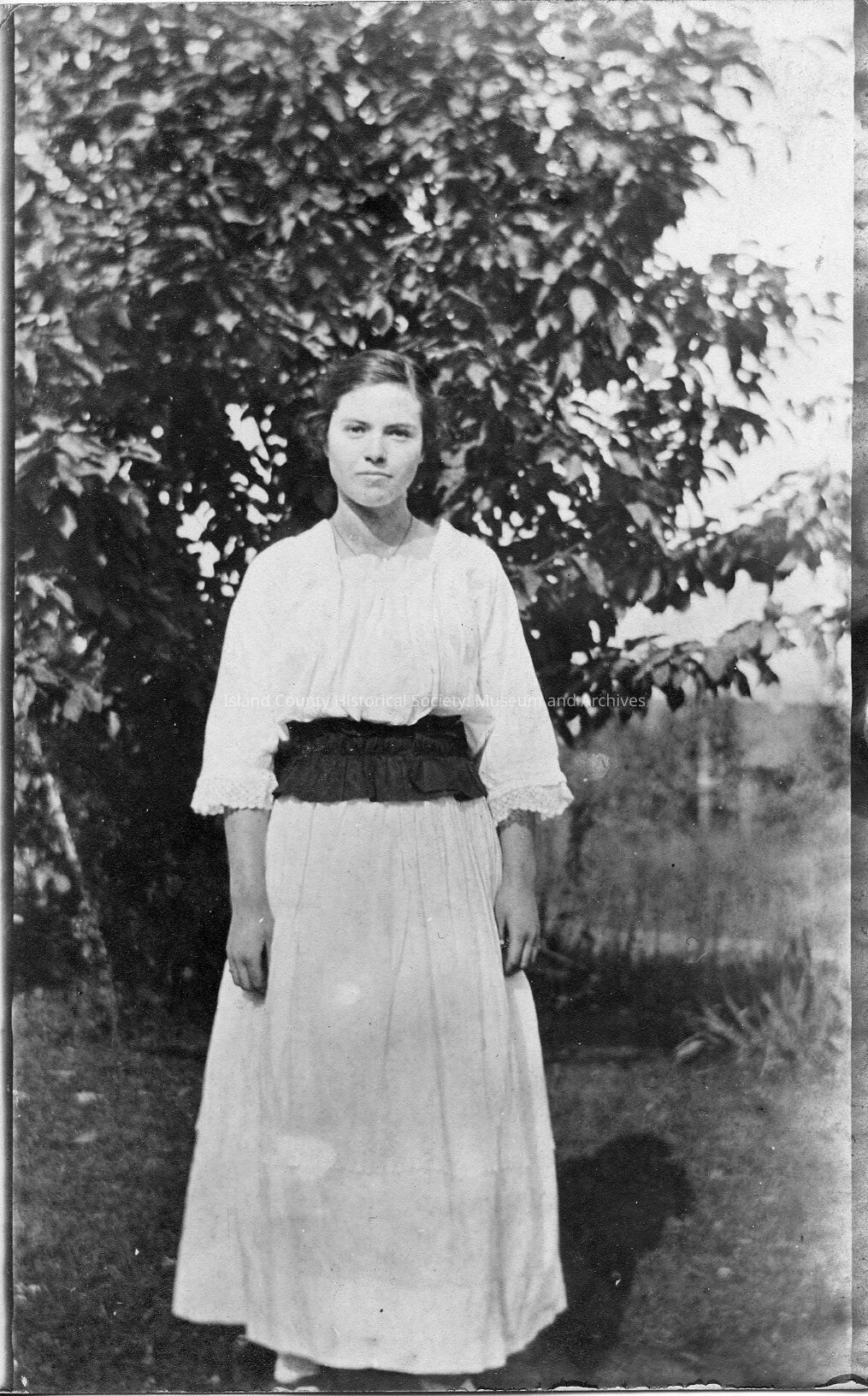 Black & white postcard of a young woman in a long dress with sash, standing in front of a tree. Based on the postcard lookup, the date is between 1914 - 1917.