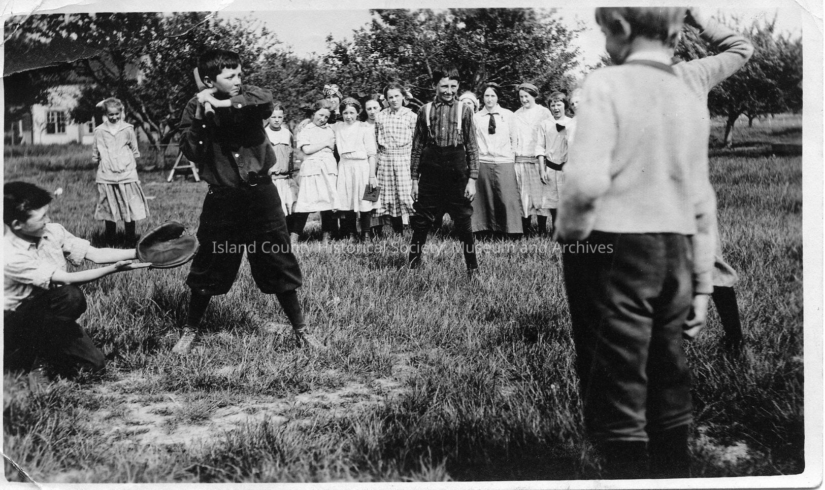 Black & white photo of a group of children playing baseball. One boy is at bat. There is a stamp on the back that says: "WE SELL CAMERAS, FILMS AND SUPPLIES, AND GUARANTEE THIS PRINT WILL NOT FADE. MAY 29,1914 J.A.JULEEN & CO. 2610 COLBY EVERETT"