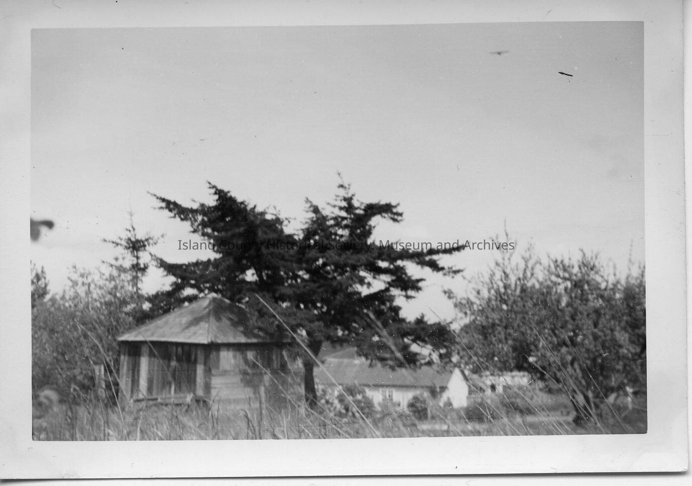 A photo of a cabin with a big tree next to it. Smaller long building behind it.