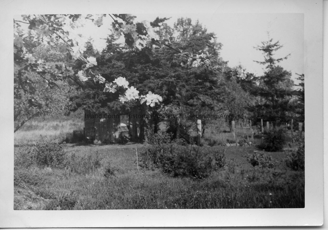 A photo of a small cabin with flowers on a tree limb across it. Handwritten on the back is "I love that old tree in front of the tool house."