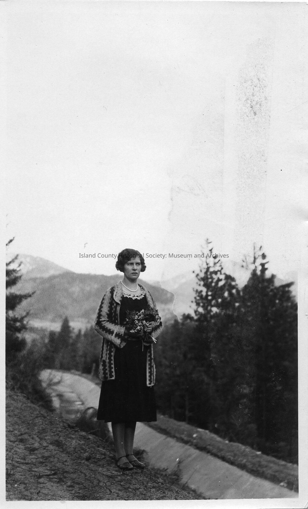 Black & white photo of a woman on a mountain trail holding a bouquet of flowers. No name or date.