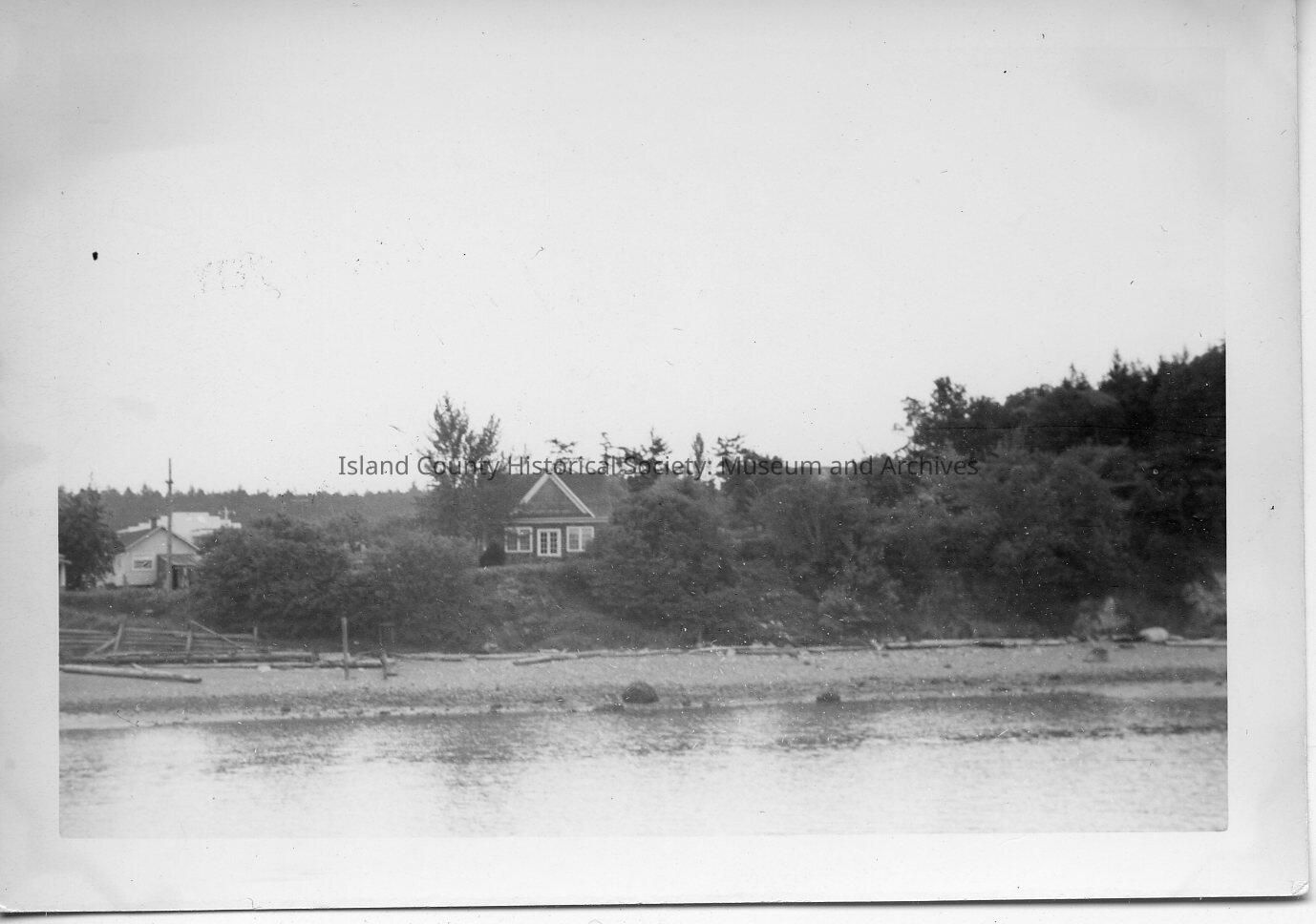 A photo of a house and another building on the left, in the midst of trees. A beach and water are in front of these buildings. Handwritten on the back is "From the dock." View is from Penn Cove looking south at the house.