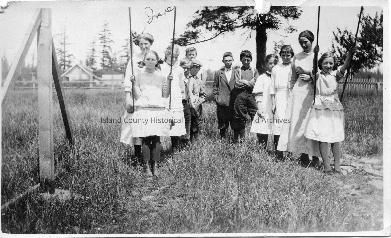 Black & white photo of a group of children with two adult women by swings. Written above one woman is the name, "Irene".