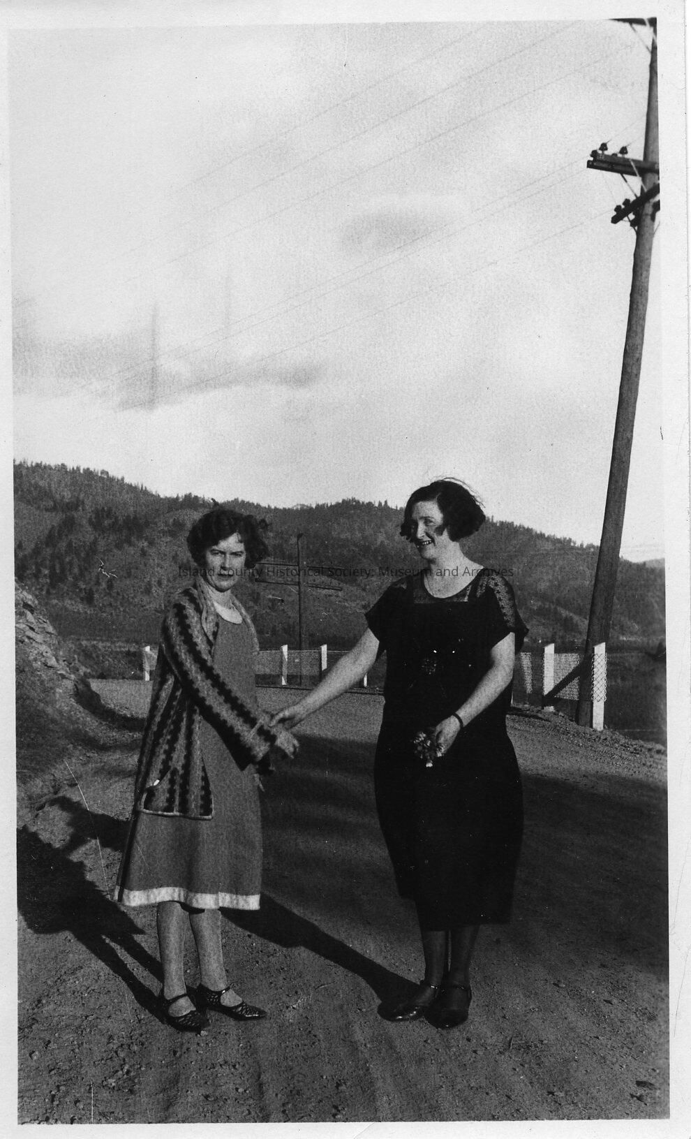Black & white photo of two women on a road. Written on the back are the names, "Irene & Lovelle". No date.