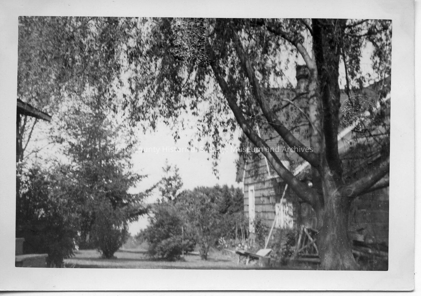 A photo of a home with a big tree filling the photo. Handwritten on the back is "Side yard."