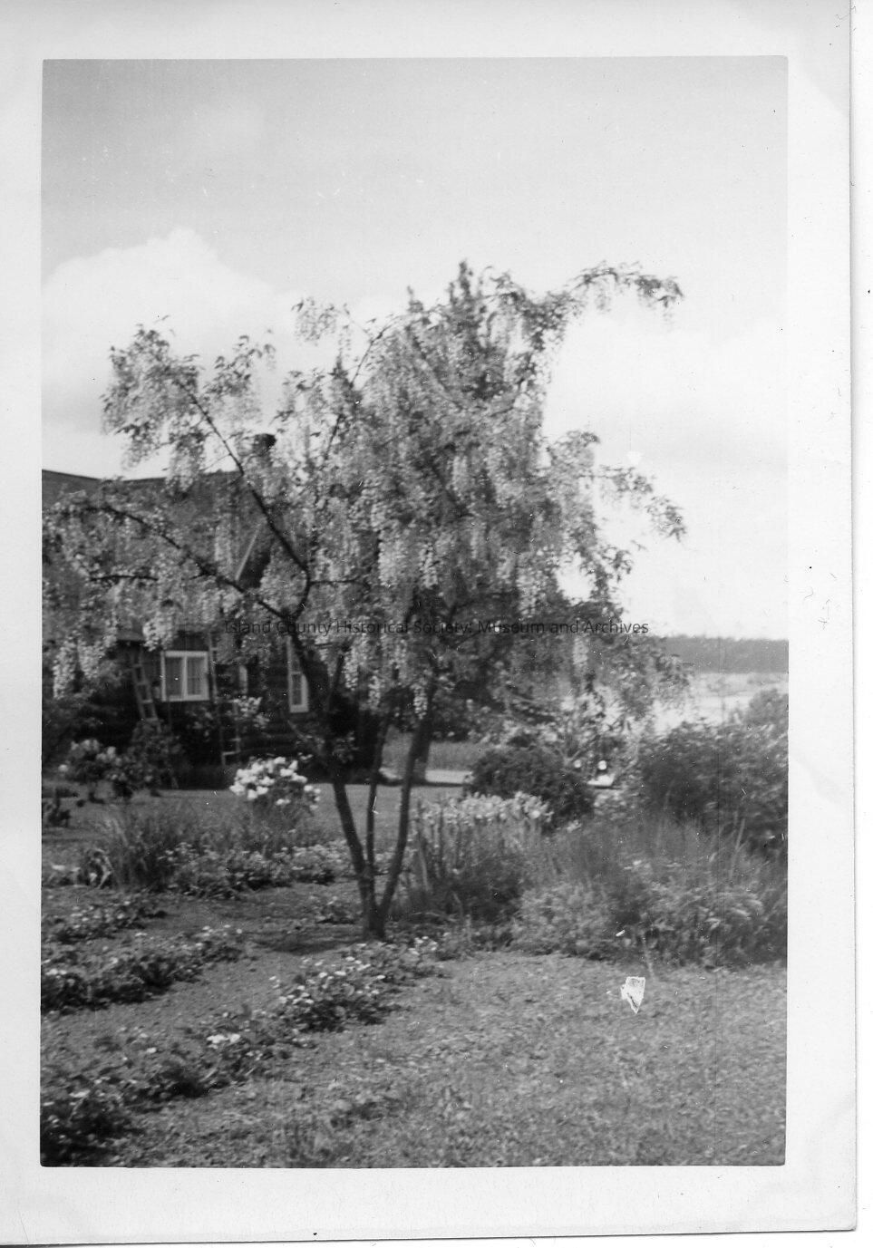 A photo of a home with a big tree in the middle and gardens too. On the back: Laburnam tree (spelling?) (It is laburnum)
