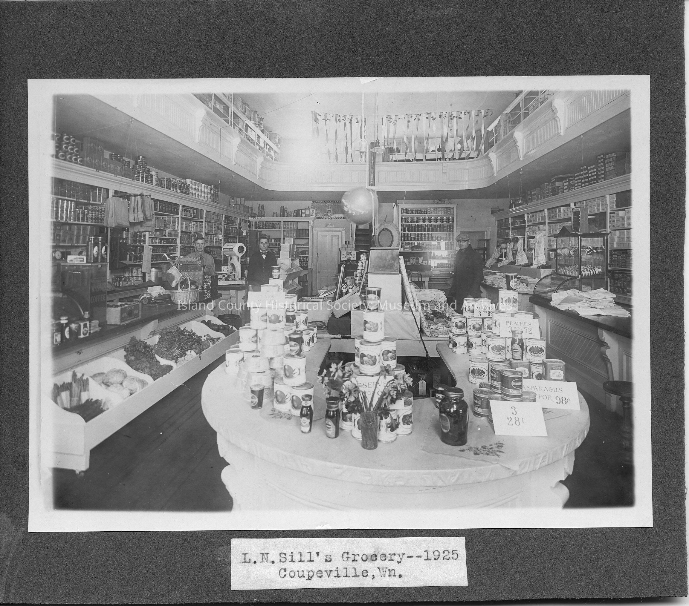 A photo of the interior of a grocery store. There are two men on the left side. Handwritten notes on the front say "L.N. Sill's Grocery -- 1925, Coupeville, Wn." On the back: 1925, Sills .... L. N. Sill Owner, Chas Strub Clerk