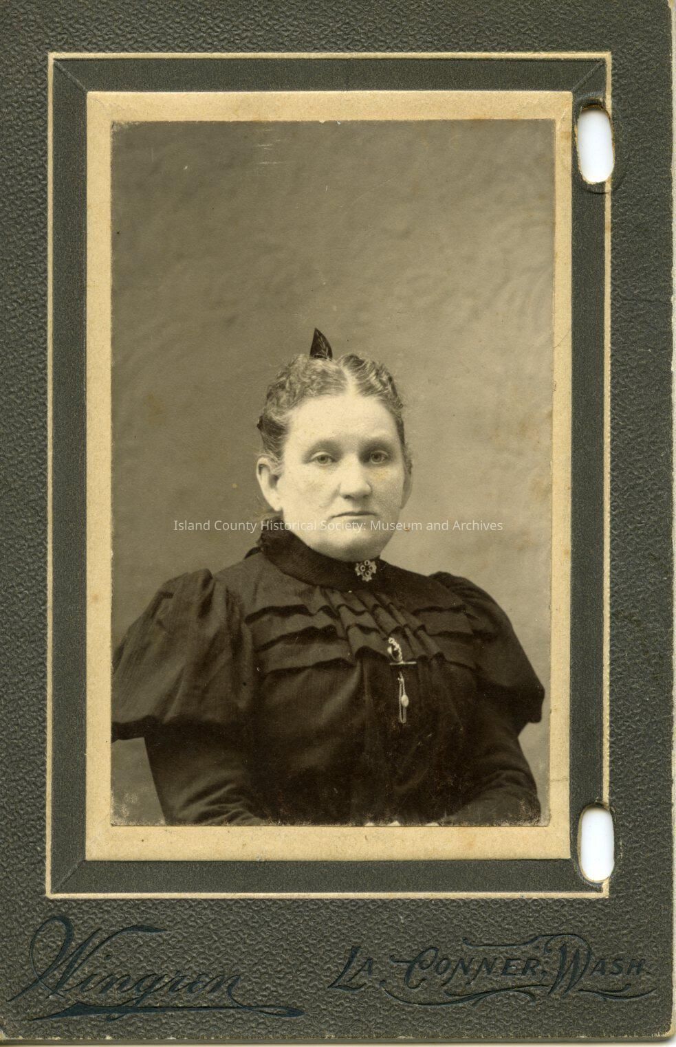 Portrait of Grace Alexander wearing a dark dress, her hair is pulled back and she has a stern expression.