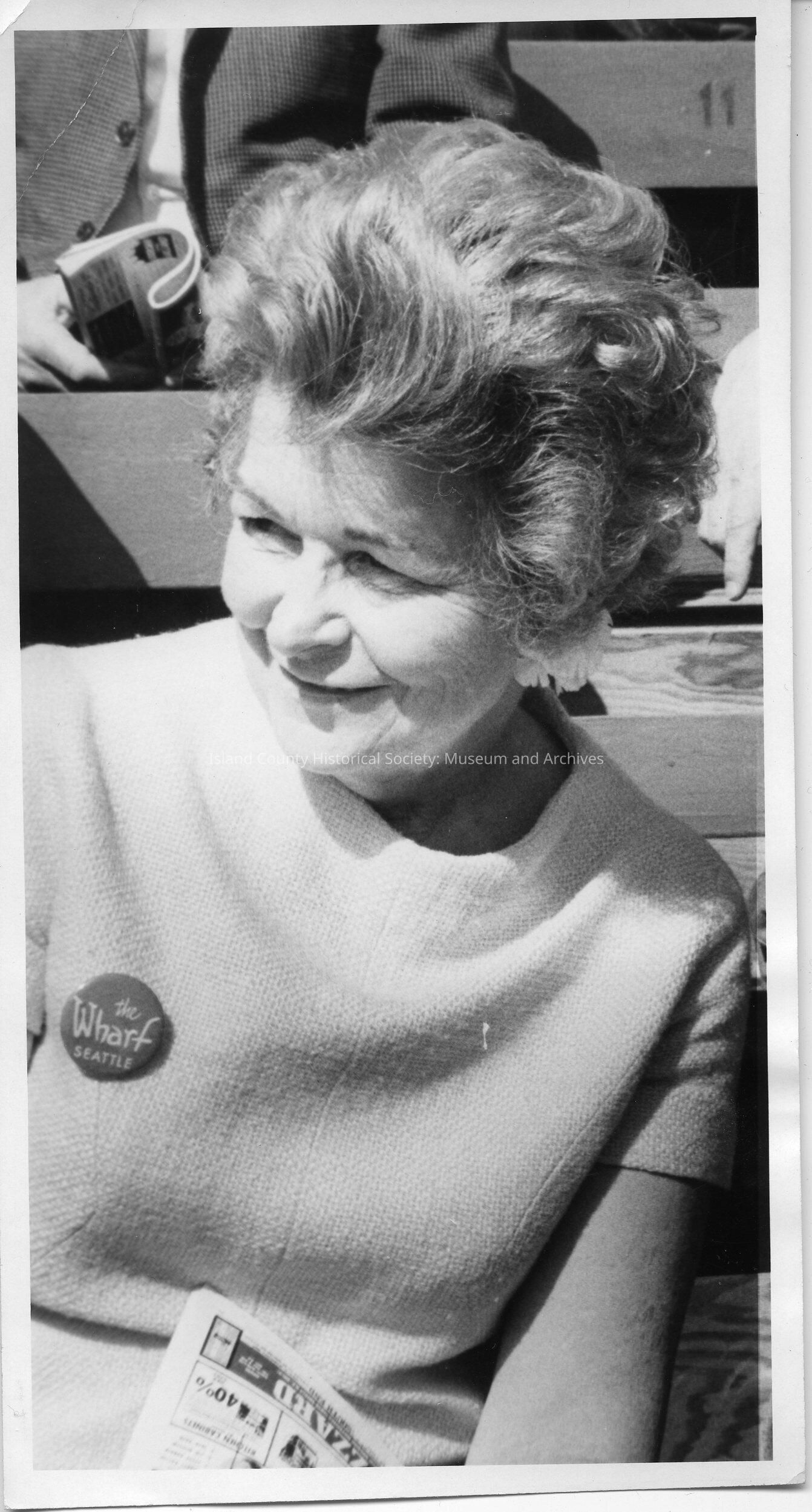 A photo of a woman looking left. She is sitting on probable a wood bleacher. She is wearing a round pin: The Wharf Seattle. Handwritten on the back is "Phyllis Smith, 1970."