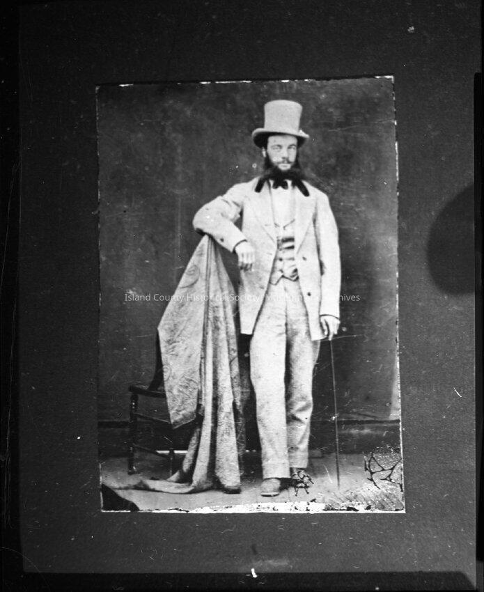 Portrait of Abram Lansdale Alexander in a suit and top hat leaning against a chair and holding a cane in the other hand.Photograph Details