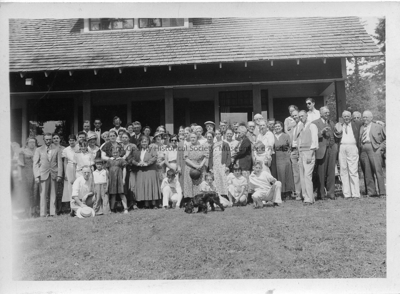 Black & white photo of a large group of men, women and children taken on a lawn outside a building. No description or date.