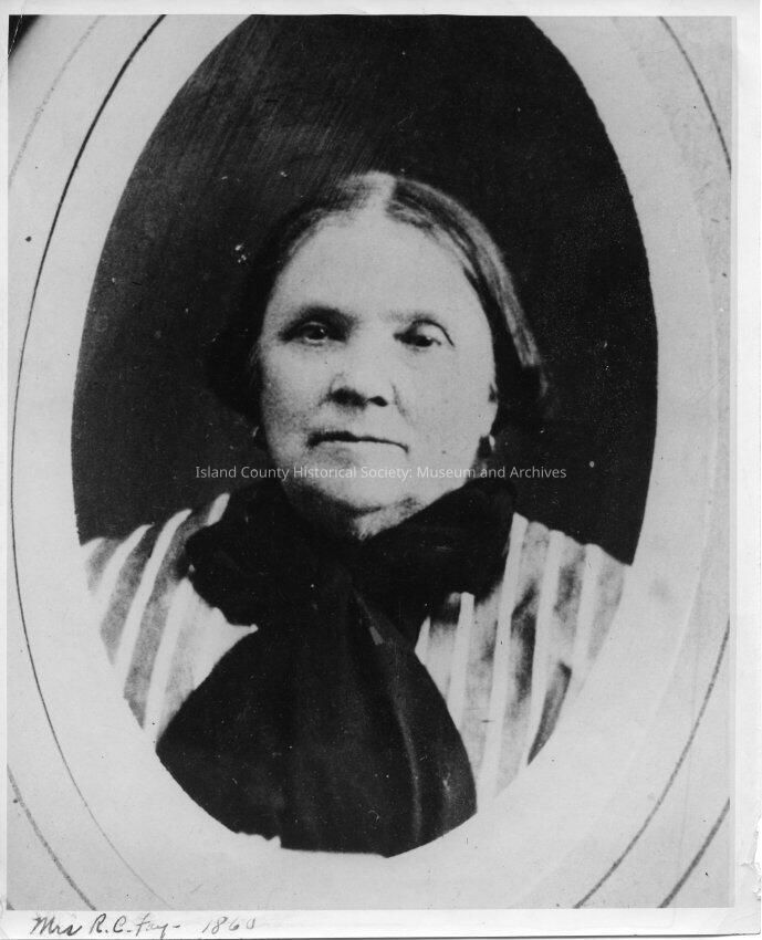Portrait of Frances Alexander wearing a dress with a giant bow on the front. On the back: Frances Sharp Alexander - widow of John Alexander - married Capt. Robert Colburn Fay - Sept. 12 1860 Coupeville, Wash. See back of photo for use and ownership.