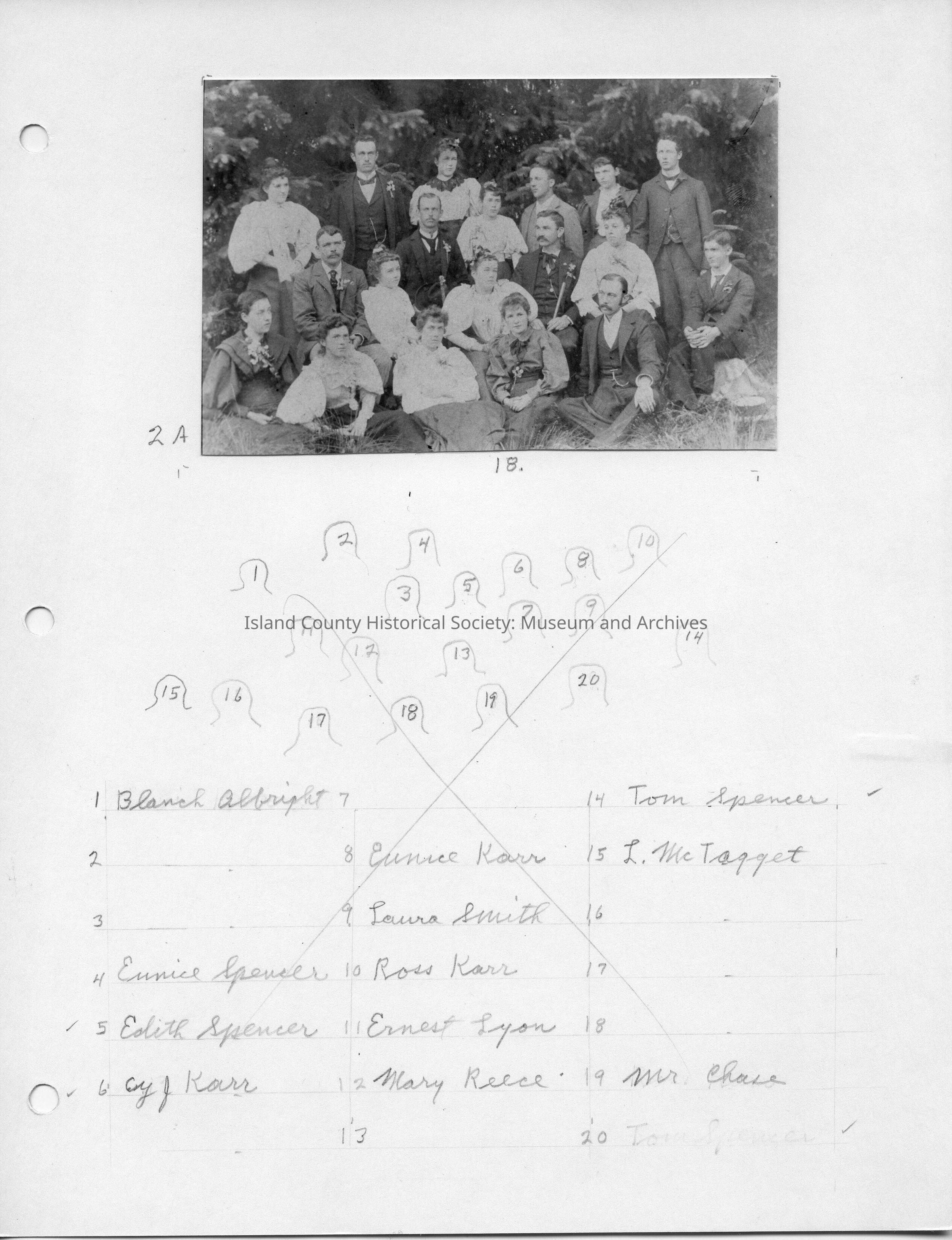 A photo of a group of people on a paper, probably family. Handwritten on the front is "Blanch Albright, Eunice Spencer, Edith Spencer, Eunice Spencer, Cy J. Karr, Eunice Karr, Laura Smith, Ross Karr, Ernest Lyon, Mary Reece, Tom Spencer, L. McTagget, Mr. Chase."Lexicon