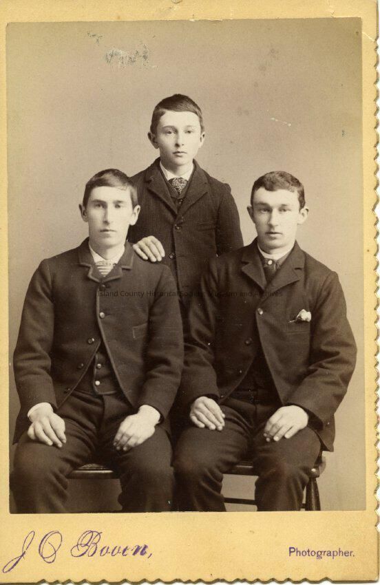 Portrait of Henry, Bert, and Fred Arnold. Taken Dec. 1889 All three boys are wearing suits.