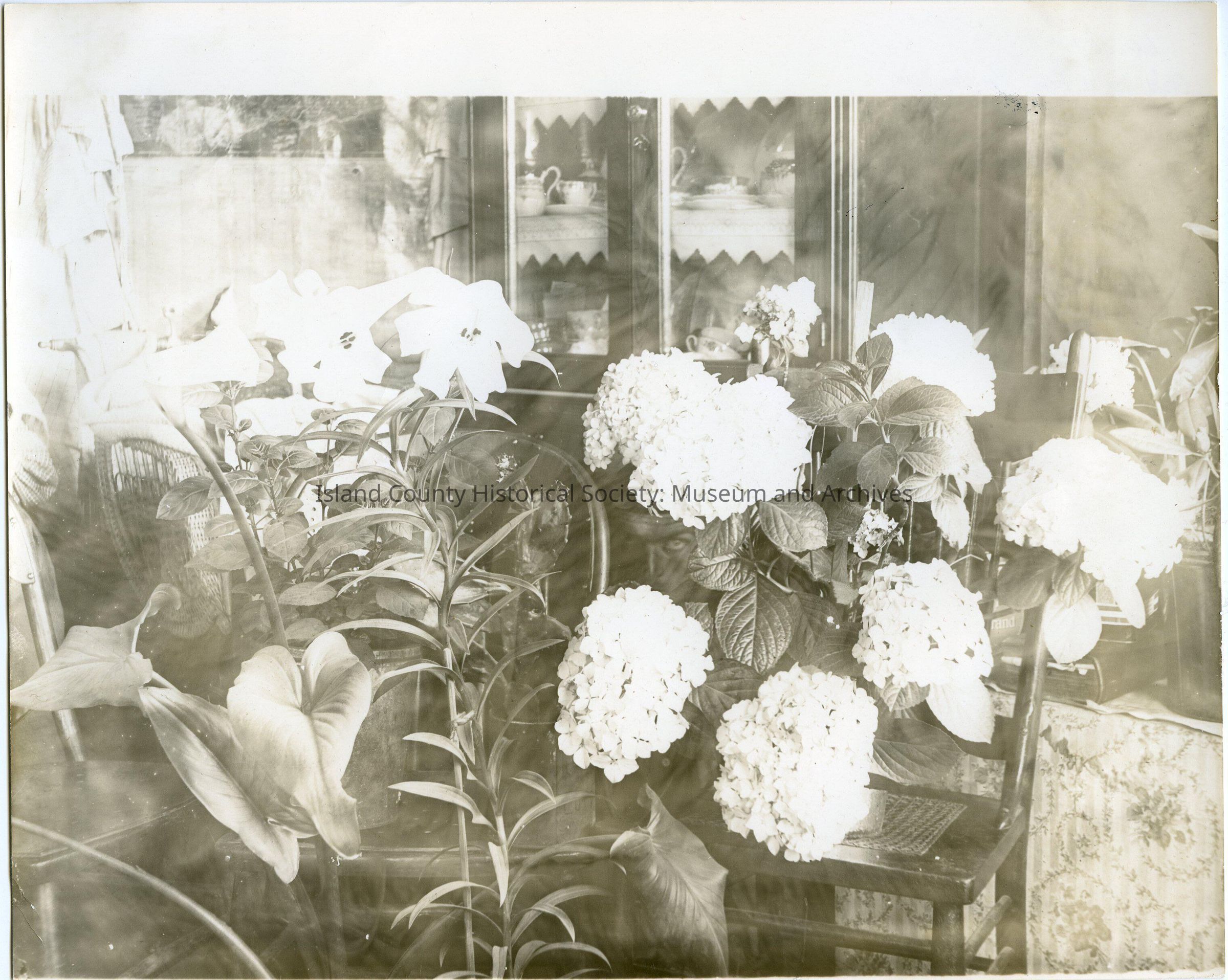 Flowers - hydrangeas, lillies, calla lilly in a group in a room of a house. There is a china cabinet and chairs behind them. Possibly taken in the kitchen of Ron Van Dyk's grandmother, Jenne Van Dyk- the old Rogers House in Oak Harbor. John Van Dyk can be seen hiding behind the hydrangias.