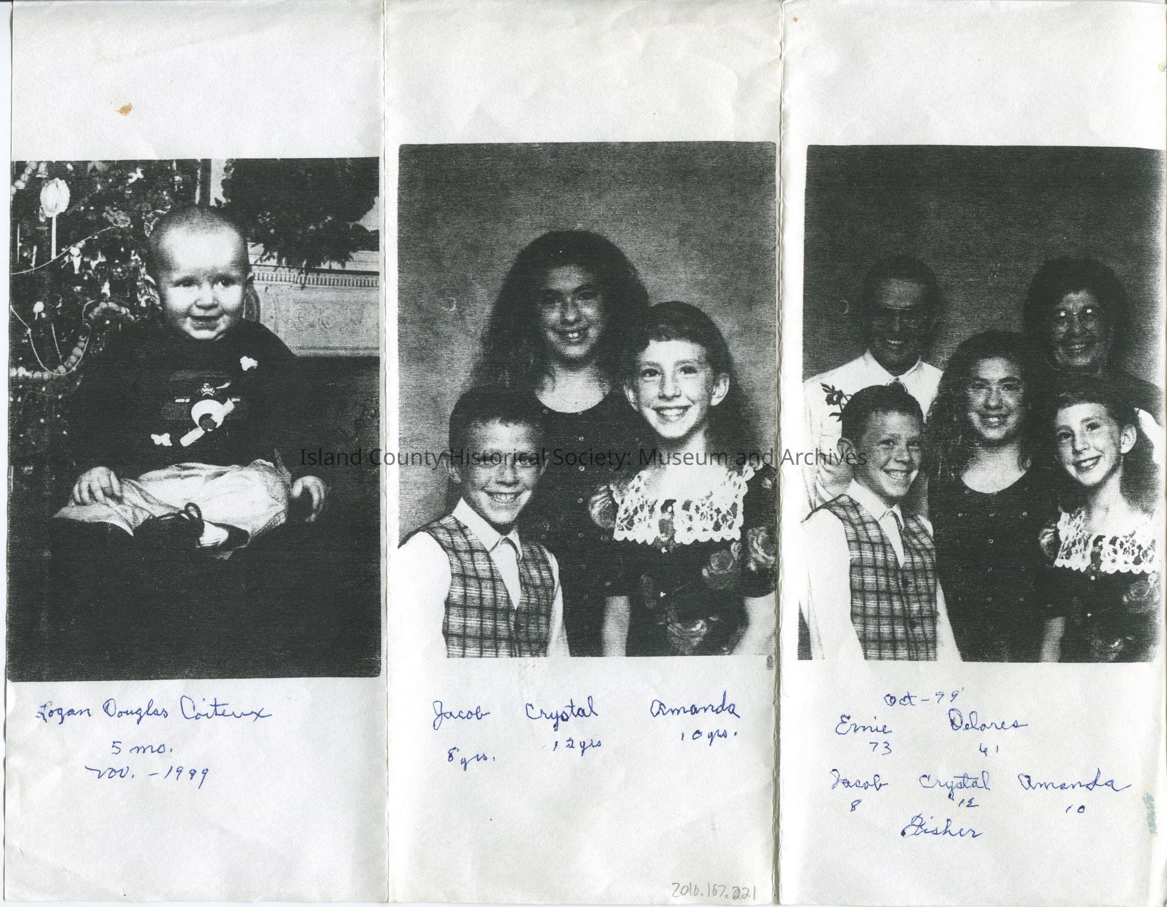 Middle photo is a portrait shot of two young girls in dresses and a young boy in a shirt & vest. Description says, "Jacob 8 yrs., Crystal 12 yrs., Amanda 10 yrs."