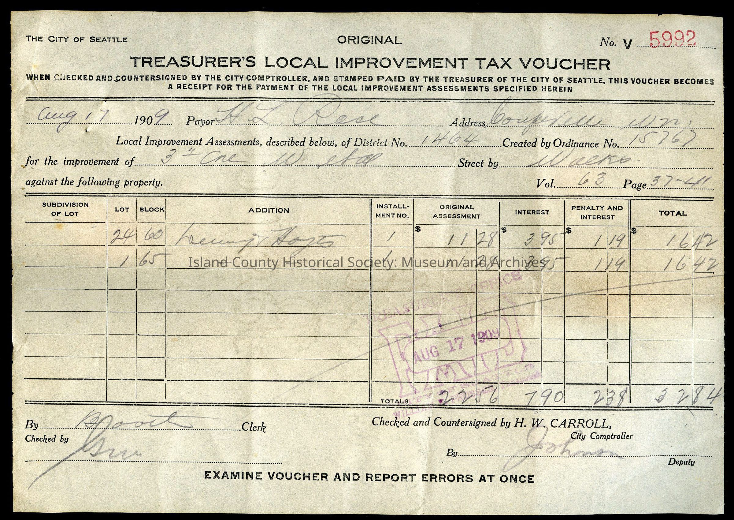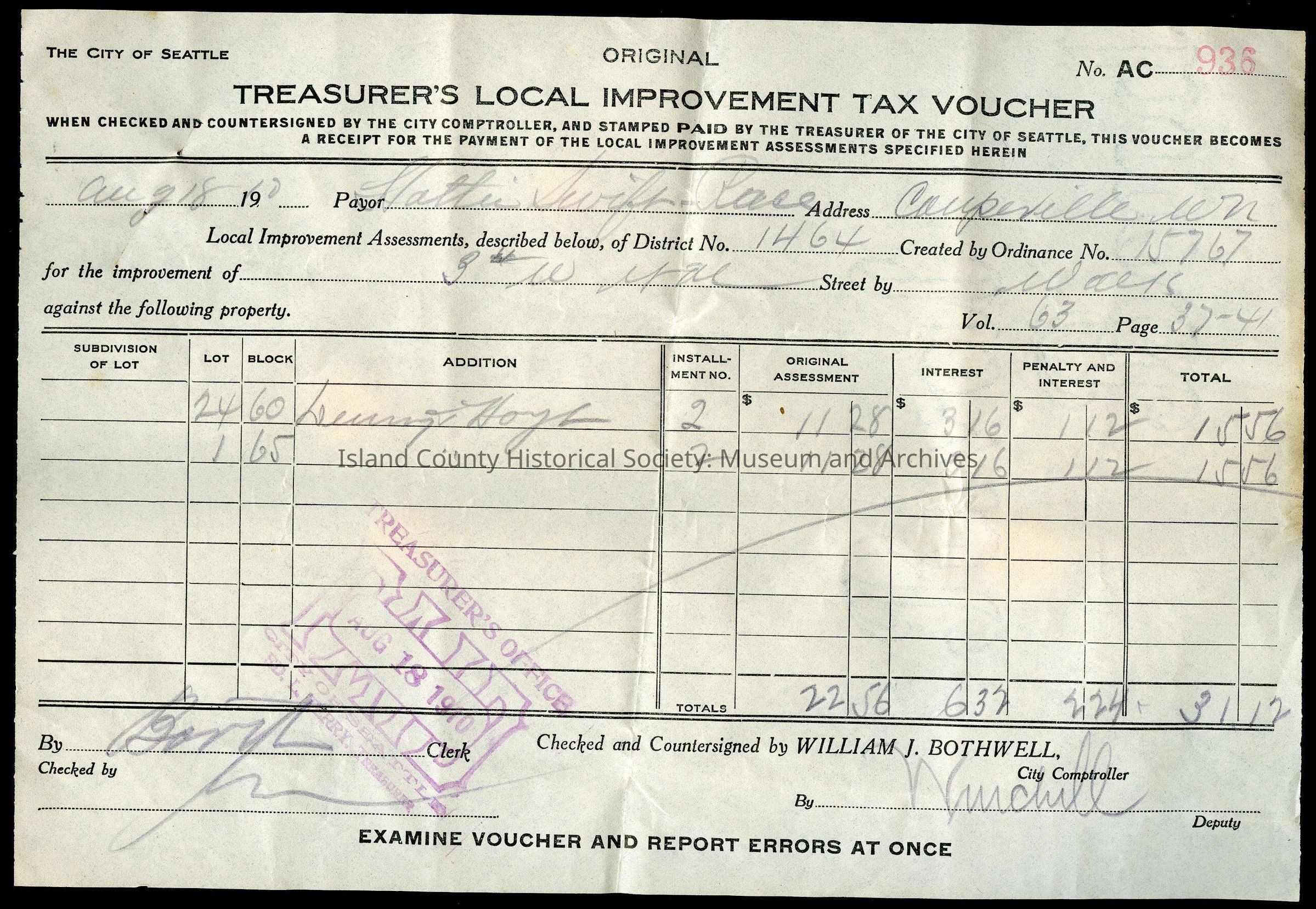 Treasurer's Local Improvement Tax Voucher - Hattie S Race, 1910Entry/Object ID