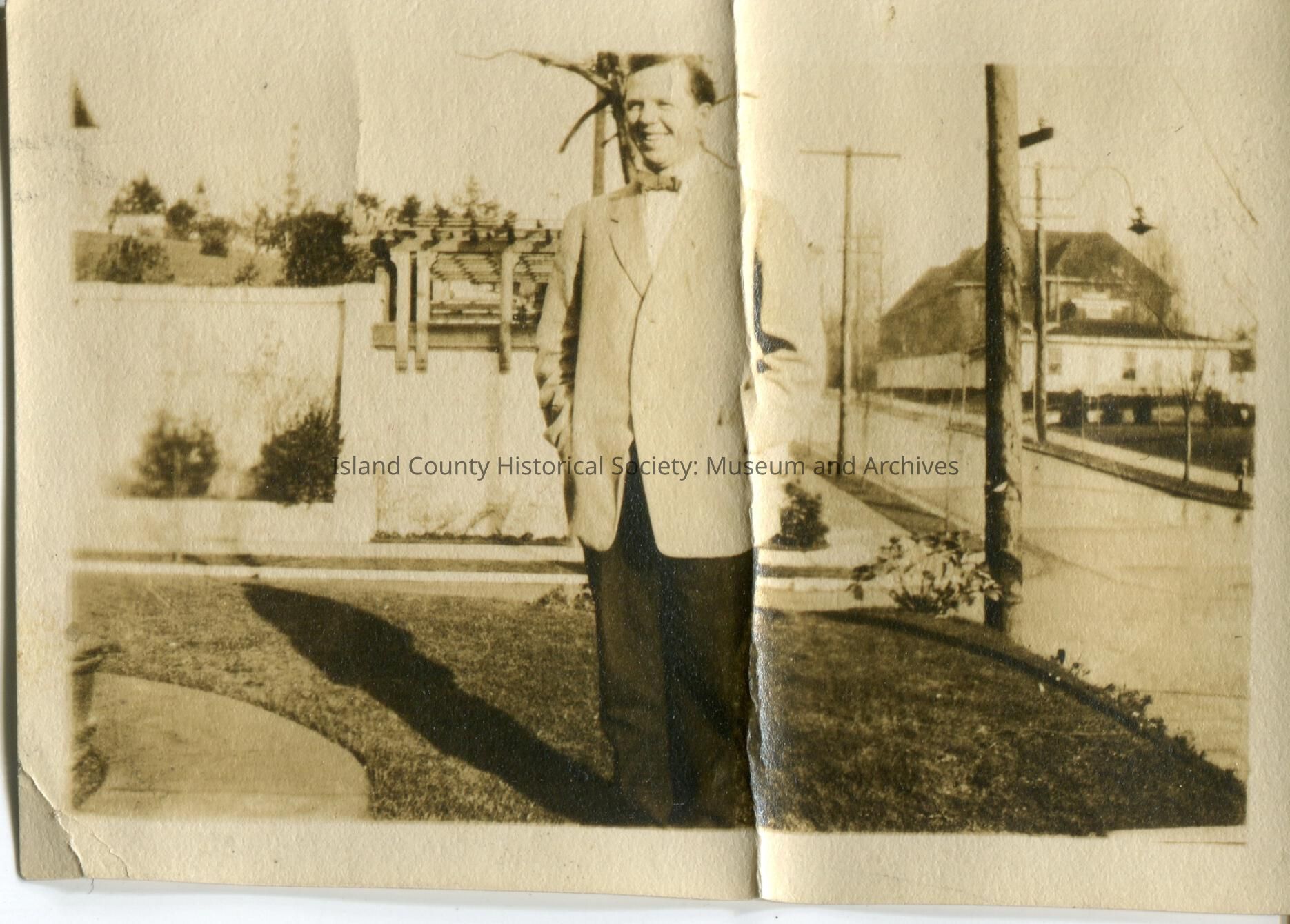 Black & white photo of a middle-aged man in a shirt with a bow tie, light colored jacket, and dark pants. Picture was taken on the front lawn of a house. No date or description.