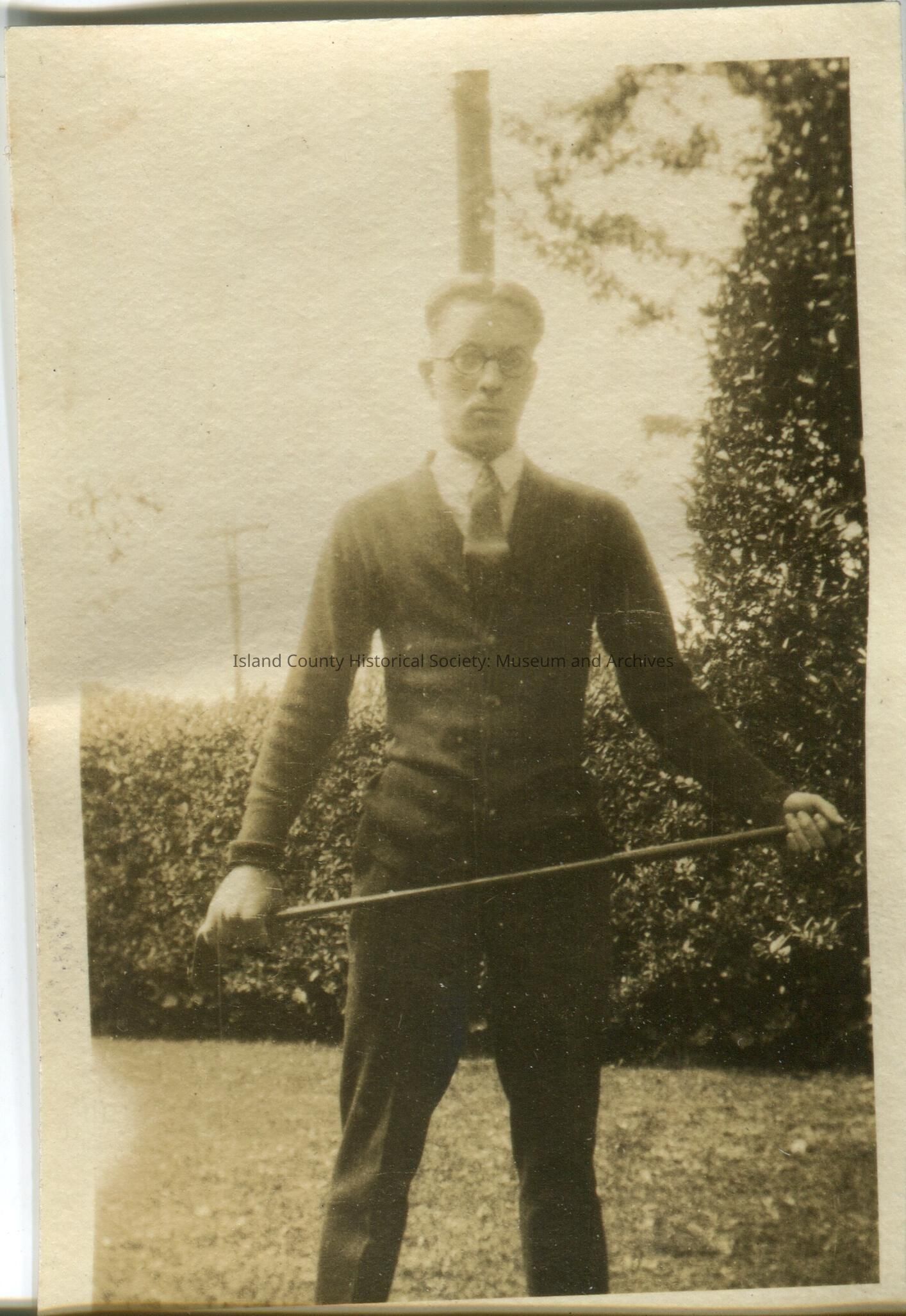 Black & white portrait of a young man dressed in dark slacks, a dark sweater, light shirt, and a striped tie. He is wearing dark rimmed eyeglasses. He is holding a golf club. Picture was taken on a lawn with a hedge behind him. No date or description.