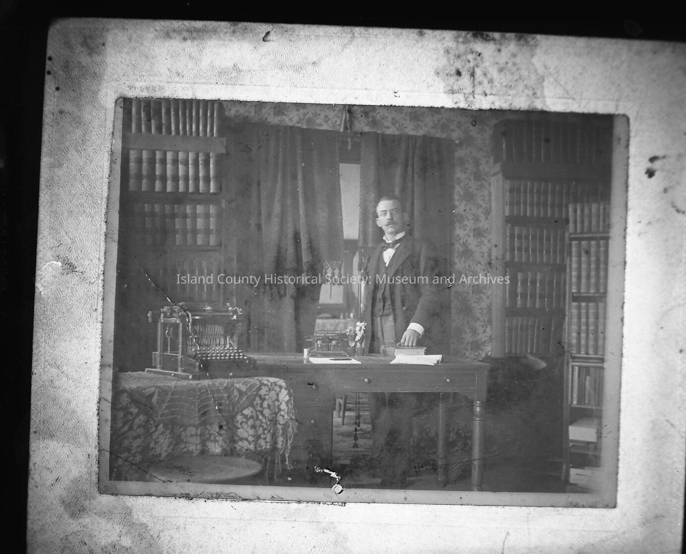 A negative photo of a man standing behind a table. There are curtains behind him and book cases on both sides of him.