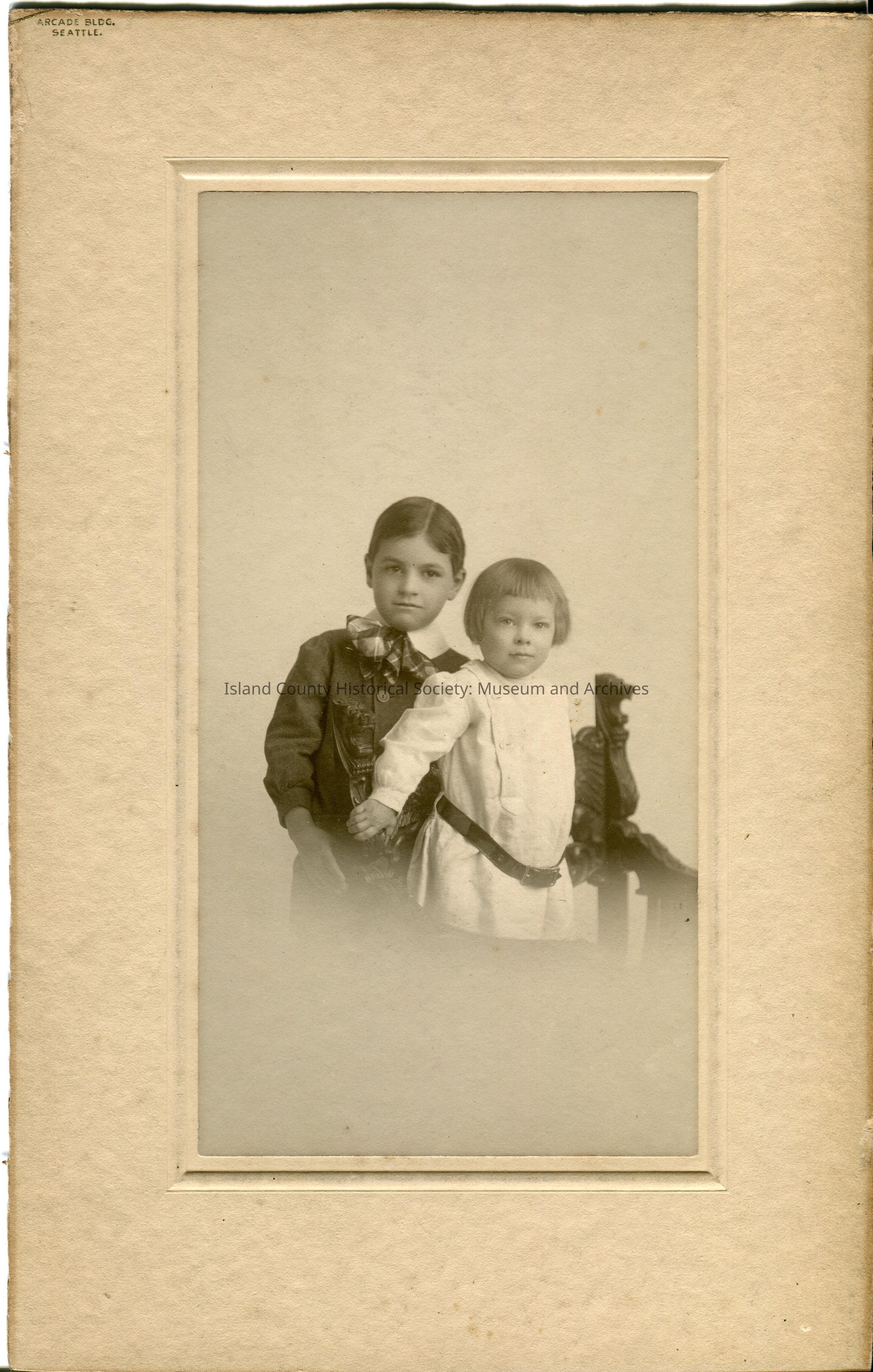 The photo is in a cardboard frame (026a) with a separate cardboard cover (026b). "Arcade Bldg. Seattle" is stamped in the upper left of the frame with the photo. Hand written on the back is written, "Frank and Duncan Dickey." Handwritten on the separate cardboard cover is written, "Frank and Duncan, taken in 1903".
