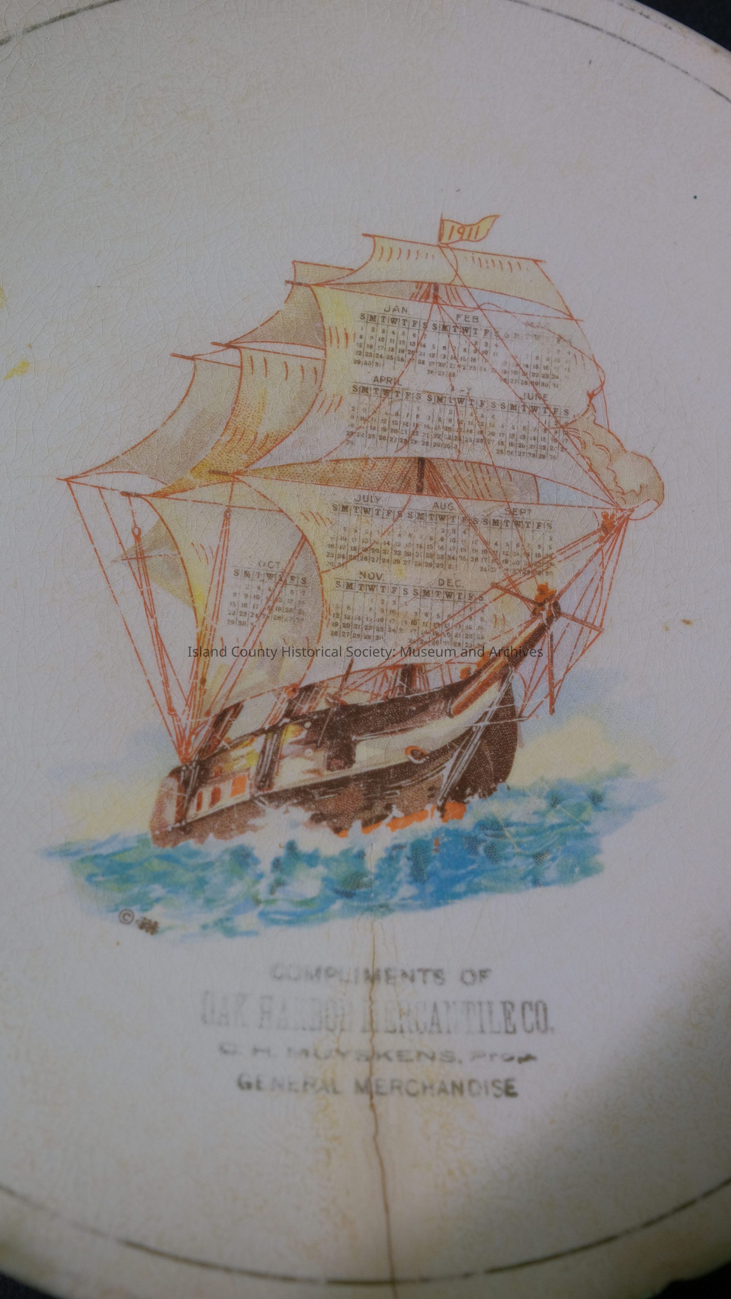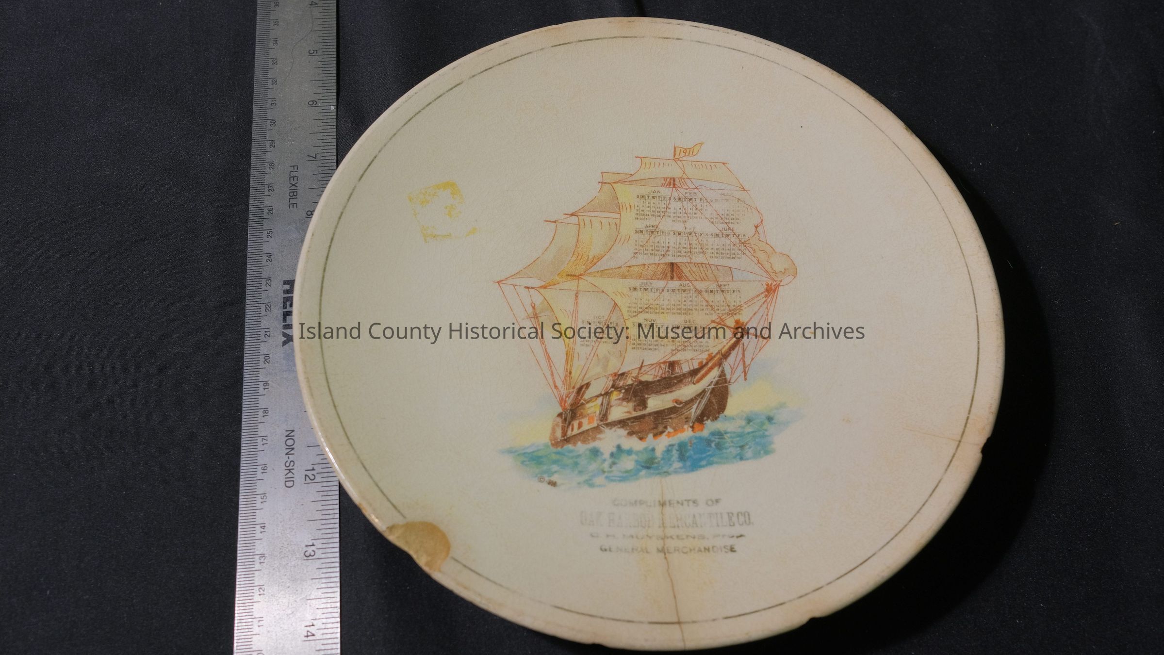 One ceramic plate with "Compliments of Oak Harbor Mercantile" and ship in the center. Oak Harbor mercantile plate.
