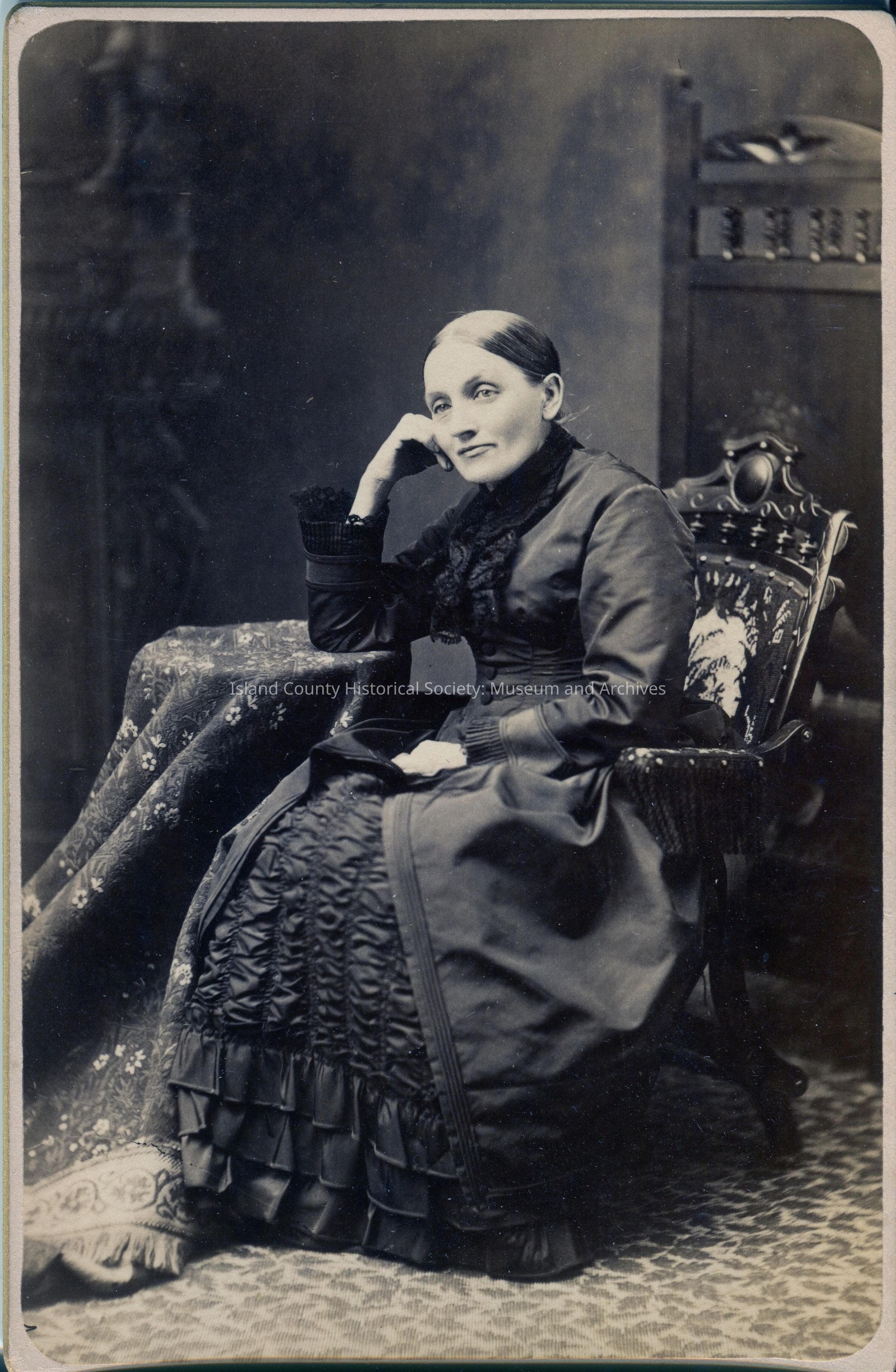 Black & white portrait of a middle aged woman with dark hair pulled back tightly behind her neck. She is wearing a dark colored floor length dress with ruffles and a matching overcoat. The material looks like it could be black satin. She is sitting in a chair with her right elbow resting on a table and her hand on her cheek. No date or description. Printed on card stock.