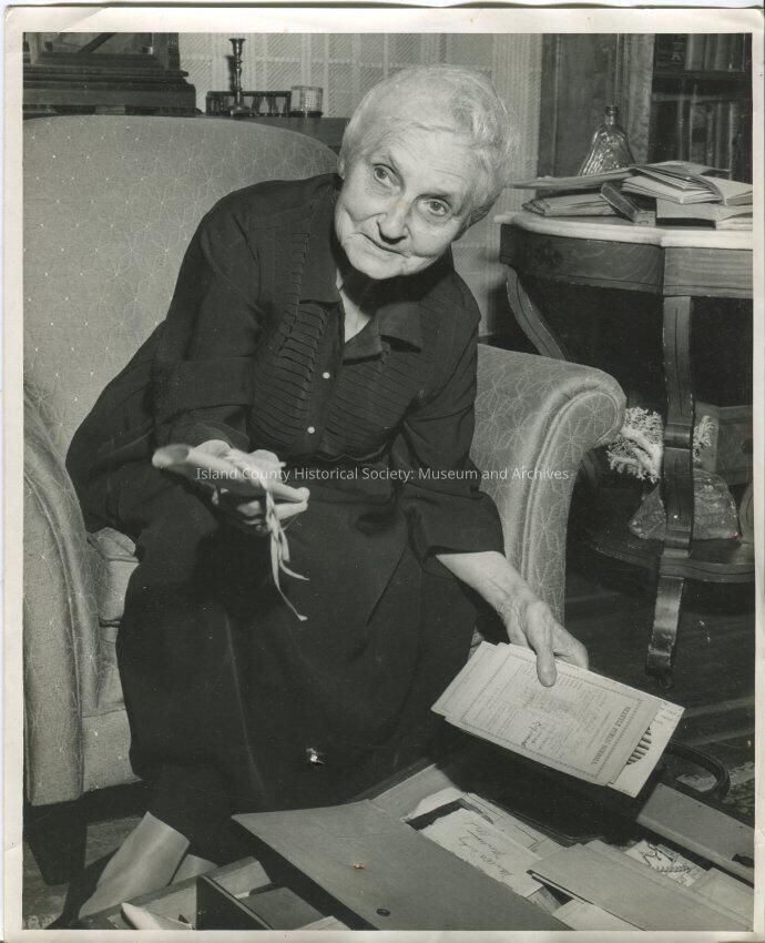 Black & white photo of an elderly white haired woman. The woman is in a dark long sleeved dress. She is sitting in an armchair bent over a box of documents. In one hand is a rolled up scroll with a ribbon, possibly a diploma. In her other hand is a Seattle Public Schools Grammar Department report card with the name "Ward" on it. There is no description or date.