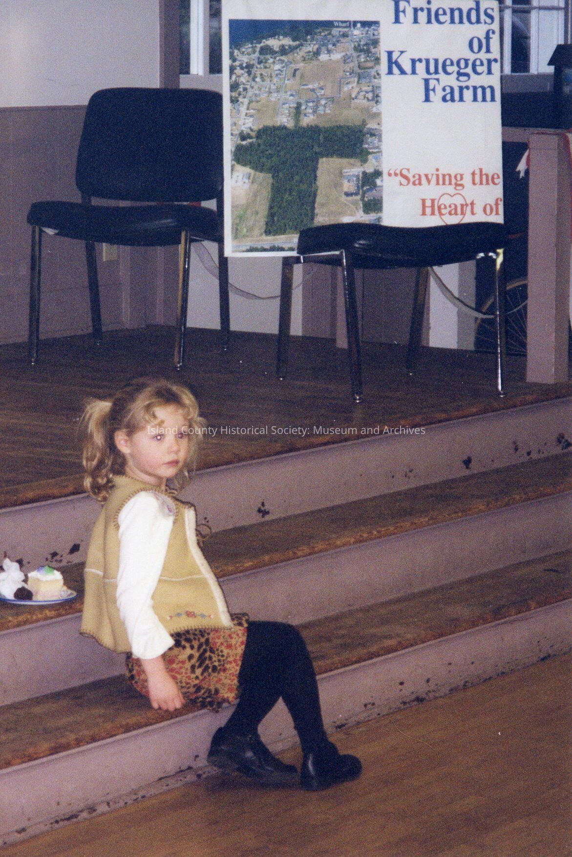Girl with refreshments sits on stage step in Coupeville Rec Hall at celebration of Friends of Krueger Farm raising money to save a portion of Krueger Farm from development. Sign on chair reads: Friends of Krueger Farm "Saving the Heart of ________"