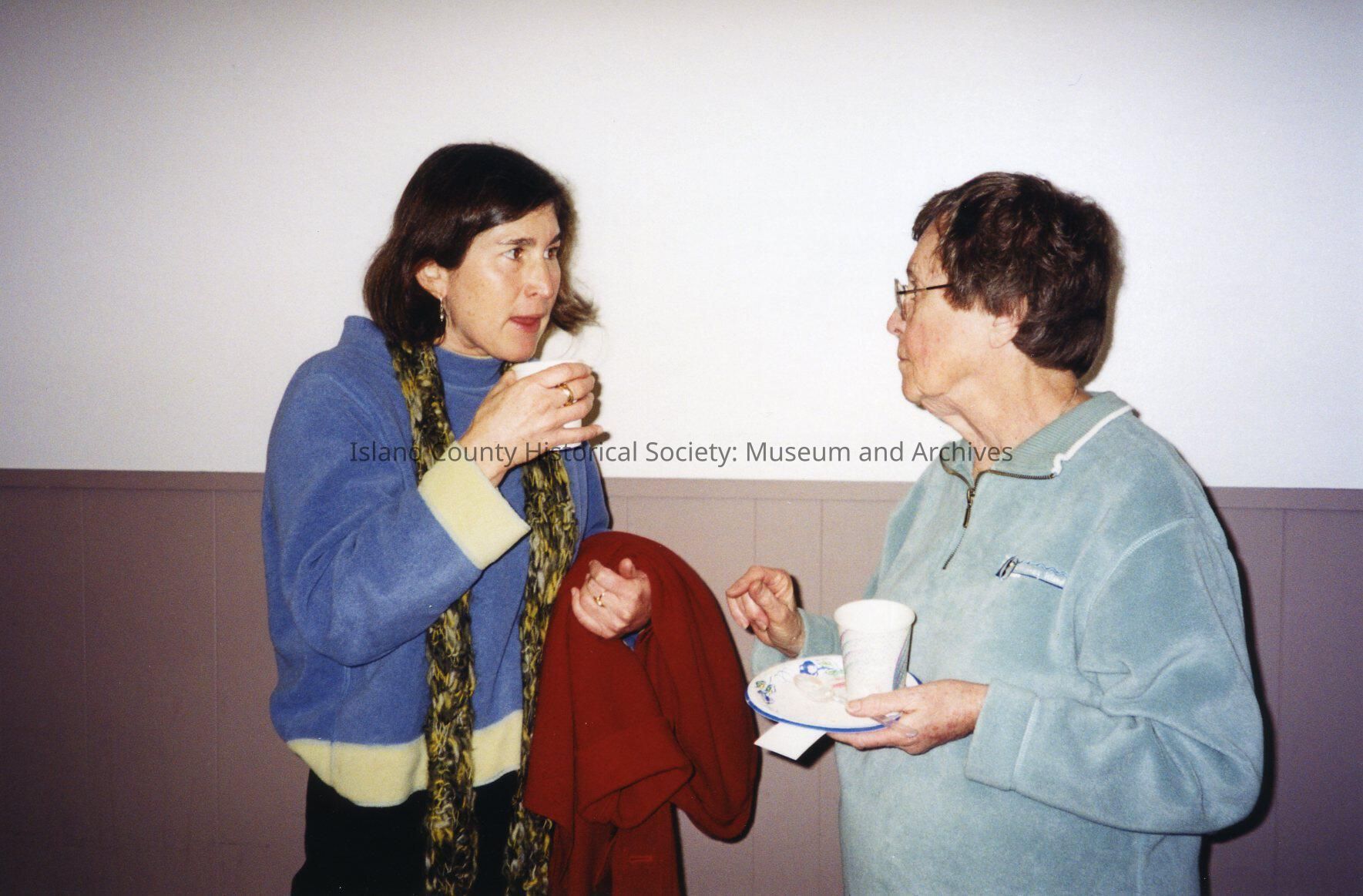 Two historians, Gretchen Luxemburg on left and Janet Enzmann on right, converse in Coupeville Rec Hall at celebration of Friends of Krueger Farm raising money to save a portion of Krueger Farm from development.
