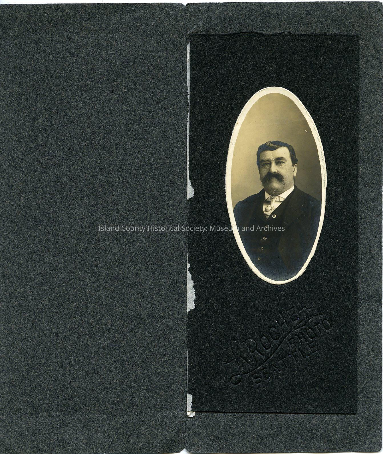 Black & white portrait photo of James Gillespie as a adult. He has dark hair and a large bushy moustache. He is wearing a dark suit jacket, vest, white shirt and striped ascot.