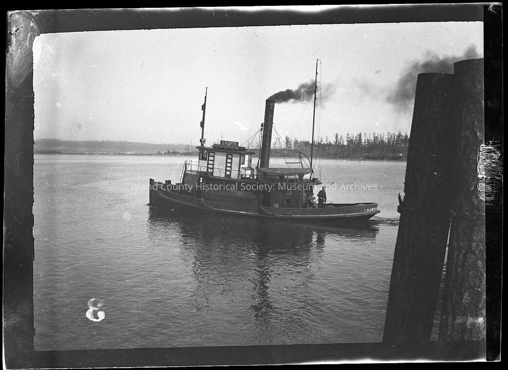 Black and white. Ferry or small steam boat. On top and on stern: "C.B. Smith". Man on board.