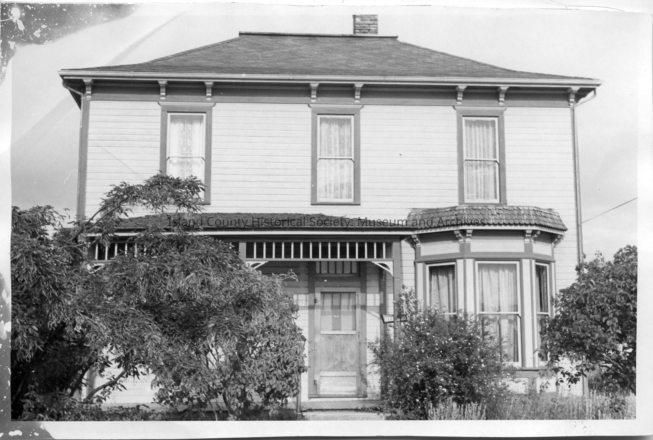 Black & white photo of the James Gillespie home in Coupeville - built in 1891. The picture was taken in 1971 before the house was relocated from 5th & Main to 704 Main Street (currently The Blue Goose Inn). There is one step up to the front door and a covered porch on the left. There is one single window under the porch on the left. To the right of the front door, there is a bay window. The second floor has three single windows.