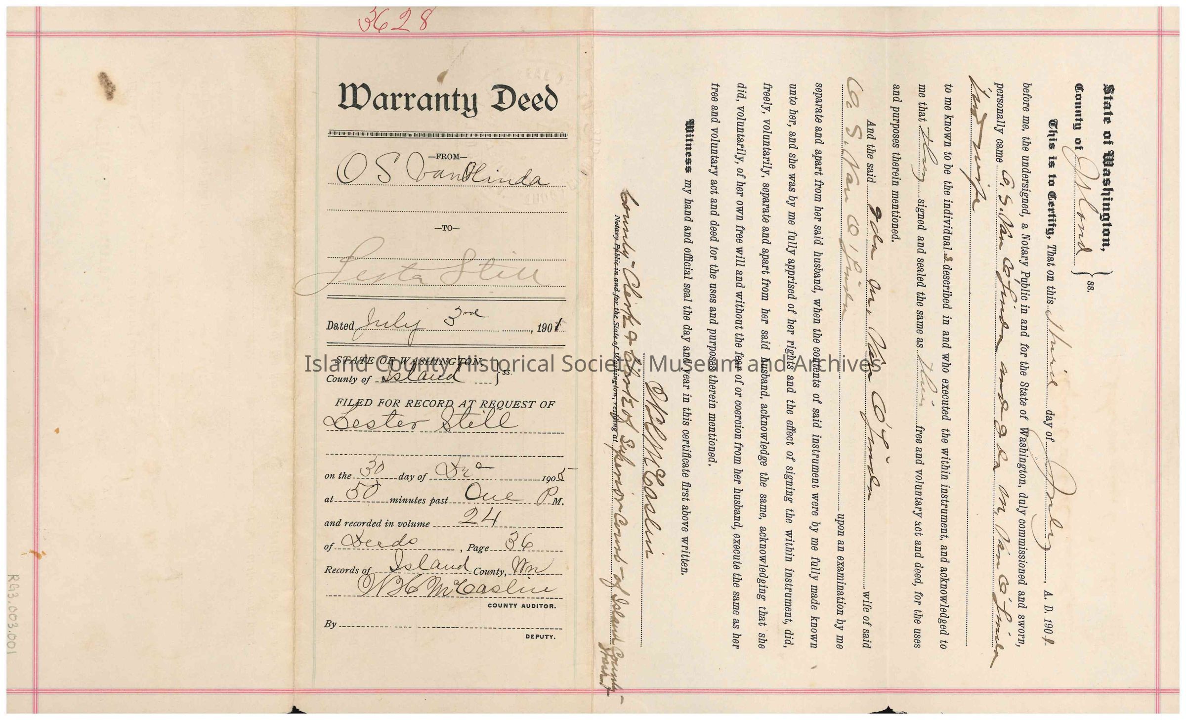 Warranty deed from O.S. Van Olinda to Lester Still, c. 3rd July 1901. This Warranty Deed is for the value of $200 dollars and for the following portions of land in Island County: "The southwest quarter (1/4) of the northwest quarter (1/4) of section eighteen (18) township (32) thirty-two, N. R. one (1) E. W. M."