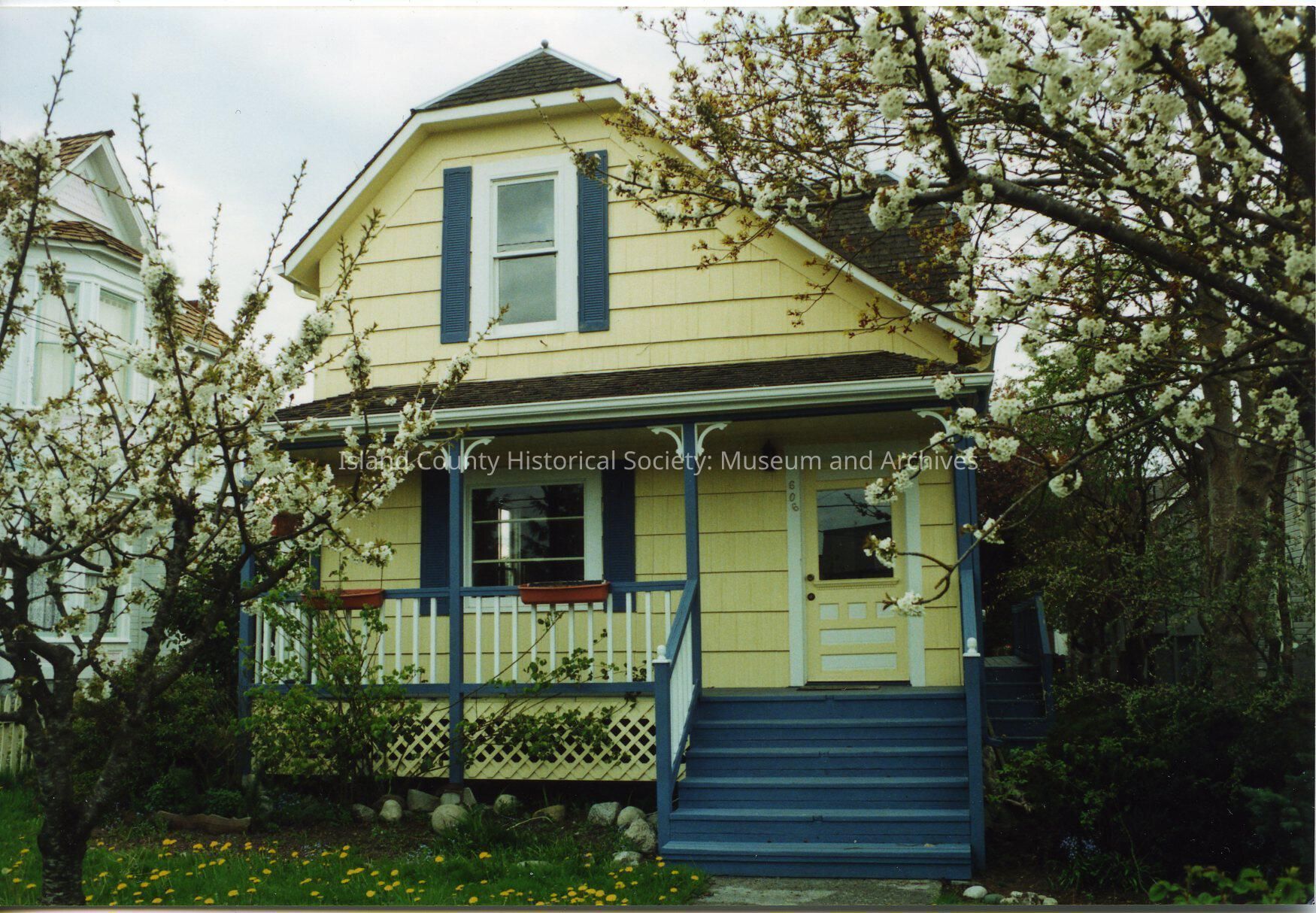 Color photo of the Carl Gillespie home at 606 N. Main St, Coupeville - built 1903. The photo shows the two-story wood shingled house from the front. The house is painted yellow with white trim, blue shutters, and blue steps. There is a covered porch to the left of the front door. There is a window under the porch on the left. The second floor has one single window and a sloping roof line on the right. There are two white flowering trees in the front yard (spring). No date on the photo.
