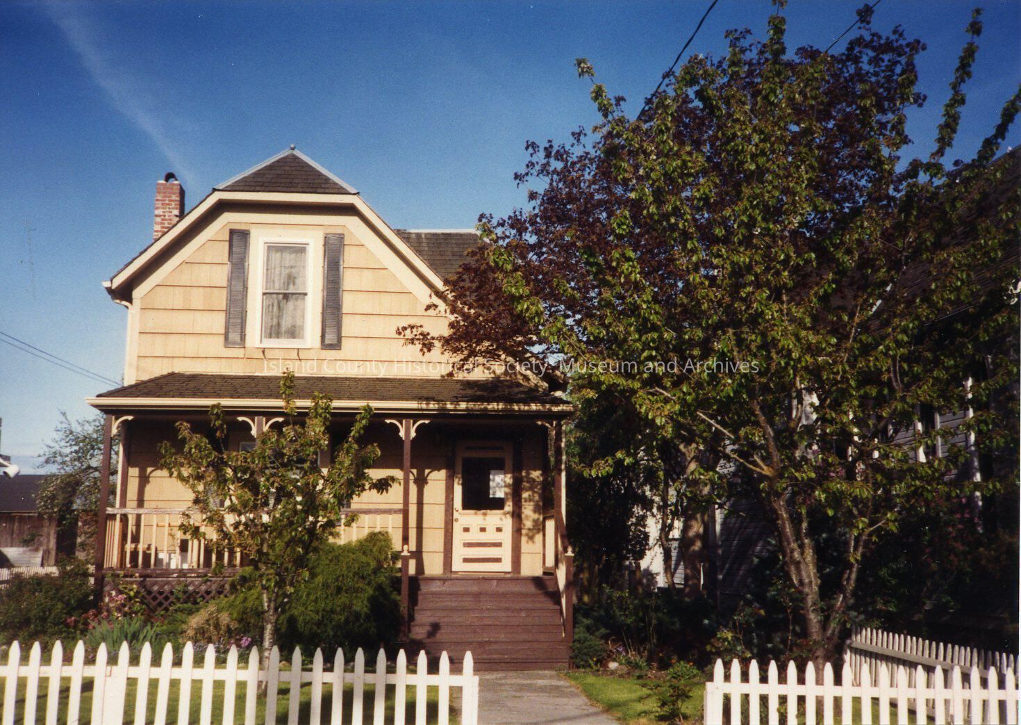 Color photo of the Carl Gillespie home at 606 N. Main St, Coupeville - built 1903. The photo shows the two-story wood shingled house from the front. The house is painted tan with white trim, gray shutters, and brown steps. There is a covered porch to the left of the front door. There is a window under the porch on the left. The second floor has one single window and a sloping roof line on the right. There is a white picket fence around the front yard. There are two green trees in the front yard (summer). No date on the photo.