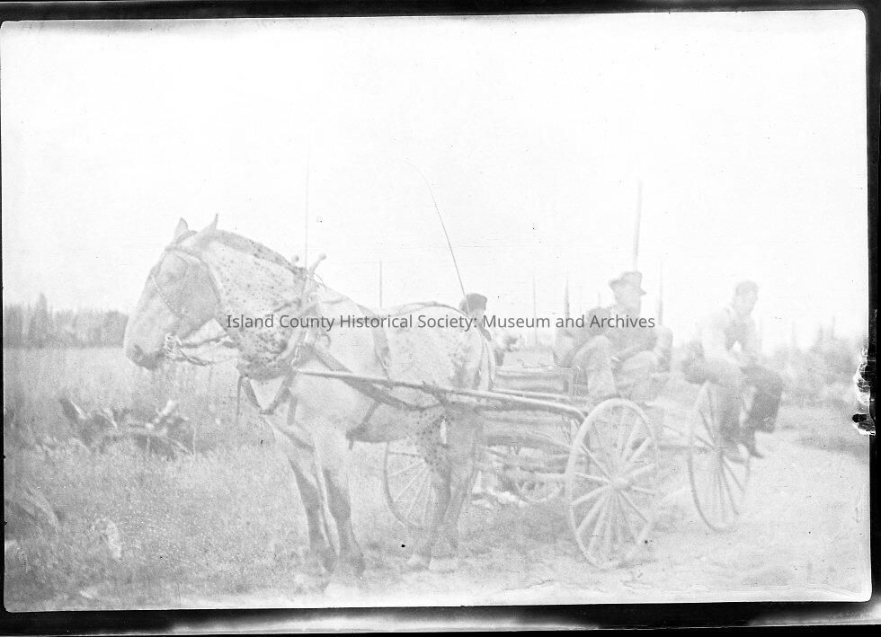 Black and white. Horse-drawn wagon with three men. One is sitting sideways in front above the wheel, another is sitting on the left back wheel (according to the wagon not the photo) and another is standing beside the front wheel on the right side of the wagon.Made/Created