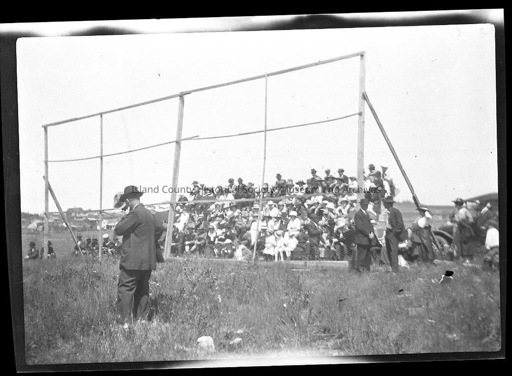 Black and white. Another view of the baseball game. People are in the stands behind the backstop. Men in suits and hats in the foreground and beside the backstop. Houses and other buildings on the rise in the background.Made/Created