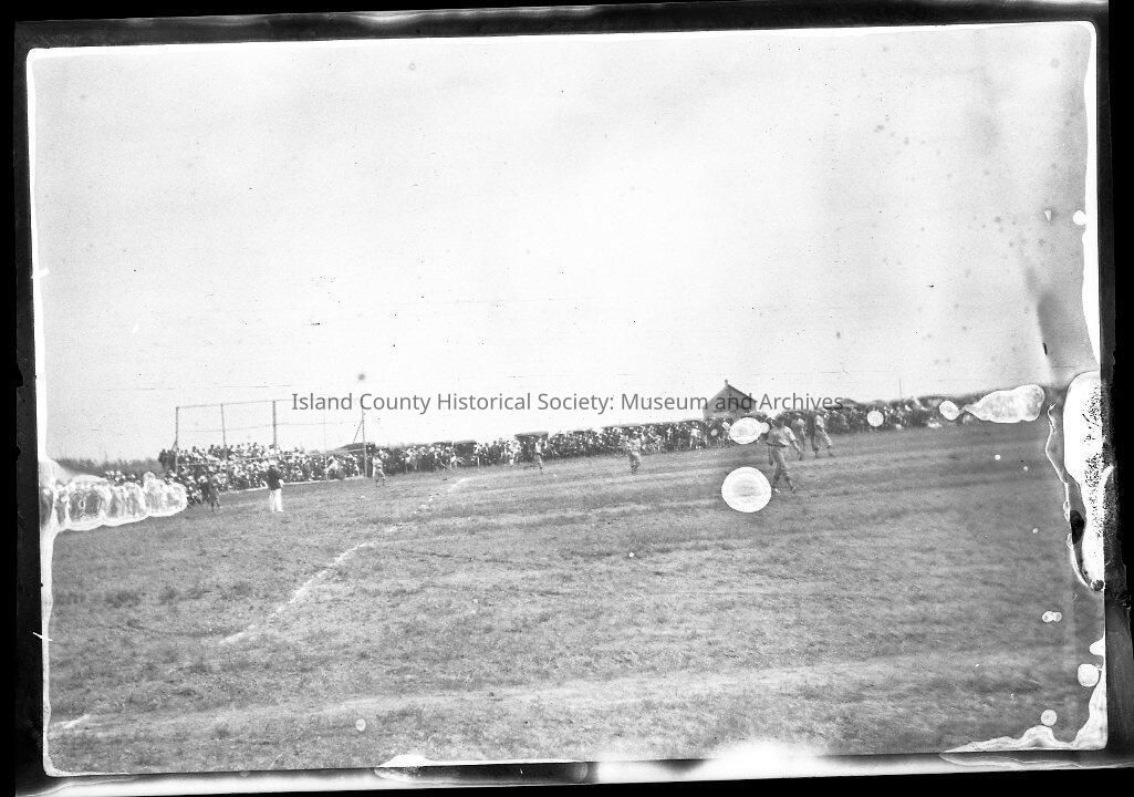 Black and white. Another view of the baseball game. The players in uniform are on the diamond, the stands and viewers are to the left. A large building just behind the diamond and field. Several areas of spot damage.Made/Created