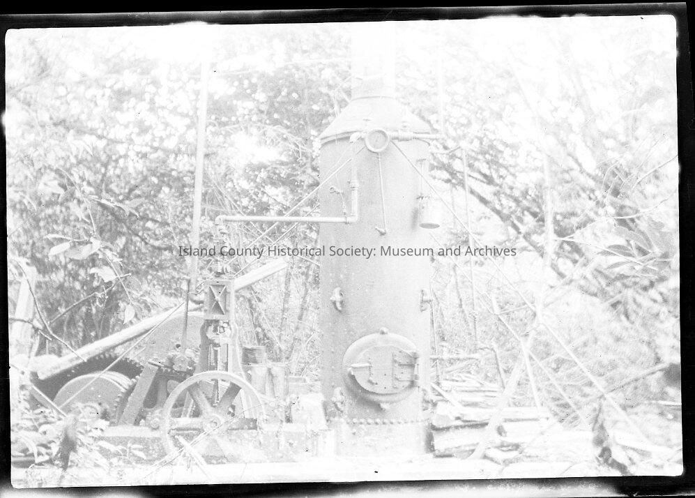Black and white. Possibly a steam engine, steam donkey. Large tubular section in the center, tupes or pipes and measuring devices, and a series of wheels and cogs.Made/Created