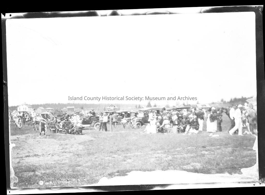Black and white. Another view of the baseball game. Cars. People walking around, sitting on benches. Biuldings in the background on the rise.Made/Created